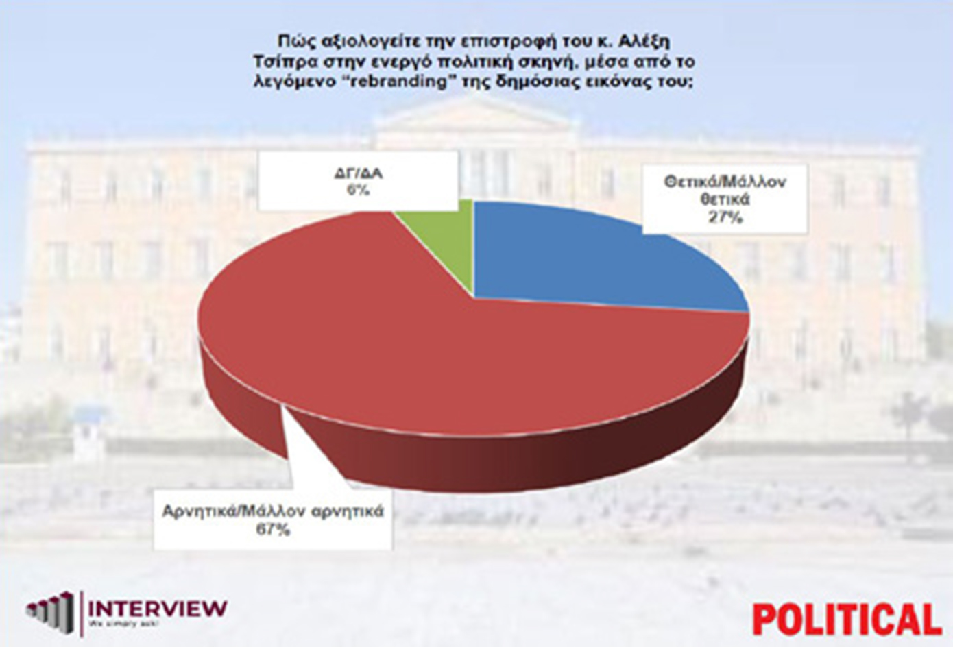 Αναφορικά με την επιστροφή του Αλέξη Τσίπρα στην πολιτική, το 29% τη βλέπει θετικά/μάλλον θετικά, το 67% αρνητικά/μάλλον αρνητικά και το 6% ΔΞ/ΔΑ.