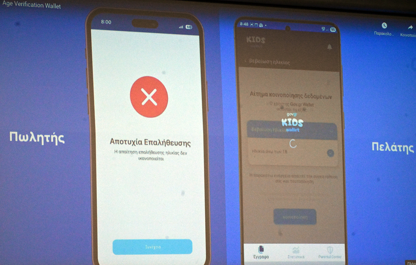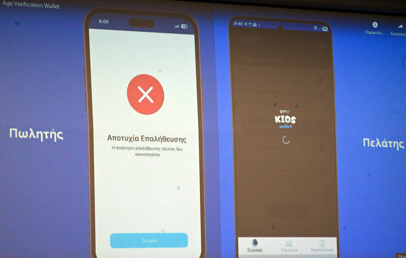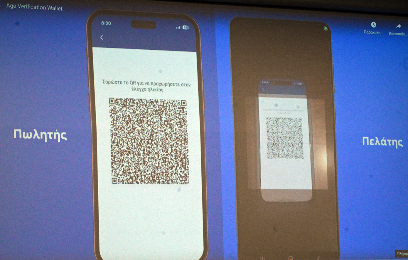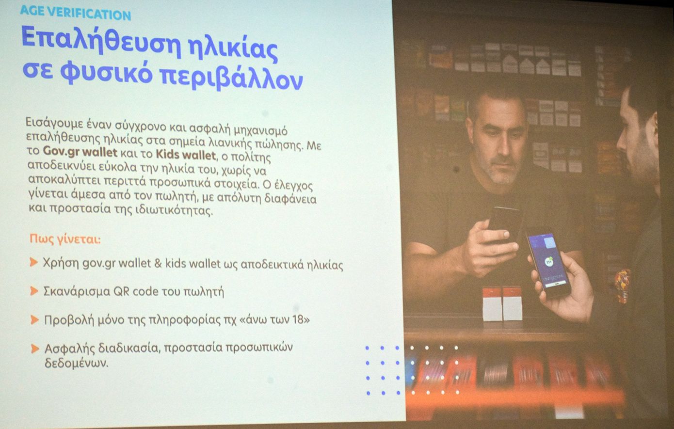 Το τρίτο εργαλείο είναι η ψηφιακή επαλήθευση ηλικίας. Όποιος θέλει να αγοράσει αλκοόλ ή καπνό θα πρέπει να δείχνει τη νέα ταυτότητα και θα υπάρχει ενημέρωση στο Gov.gr wallet για να υπάρχει η επιλογή ελέγχου ηλικίας. Ο πωλητής δεν θα χρειάζεται να συνδεθεί. Βγαίνει ένα QR Code και, αν κάποιος είναι ανήλικος, θα βγαίνει ένα κόκκινο σήμα που θα δείχνει ότι ο υποψήφιος αγοραστής είναι κάτω των 18.