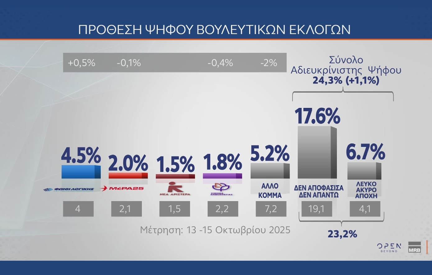Η MRB πραγματοποίησε δημοσκόπηση για το OPEN, καταγράφοντας τη γνώμη των πολιτών για το πολιτικό σκηνικό.