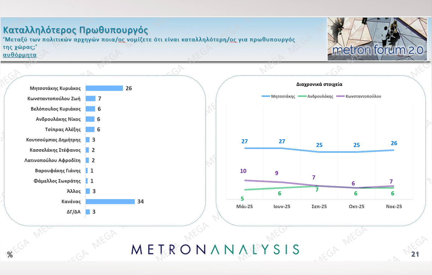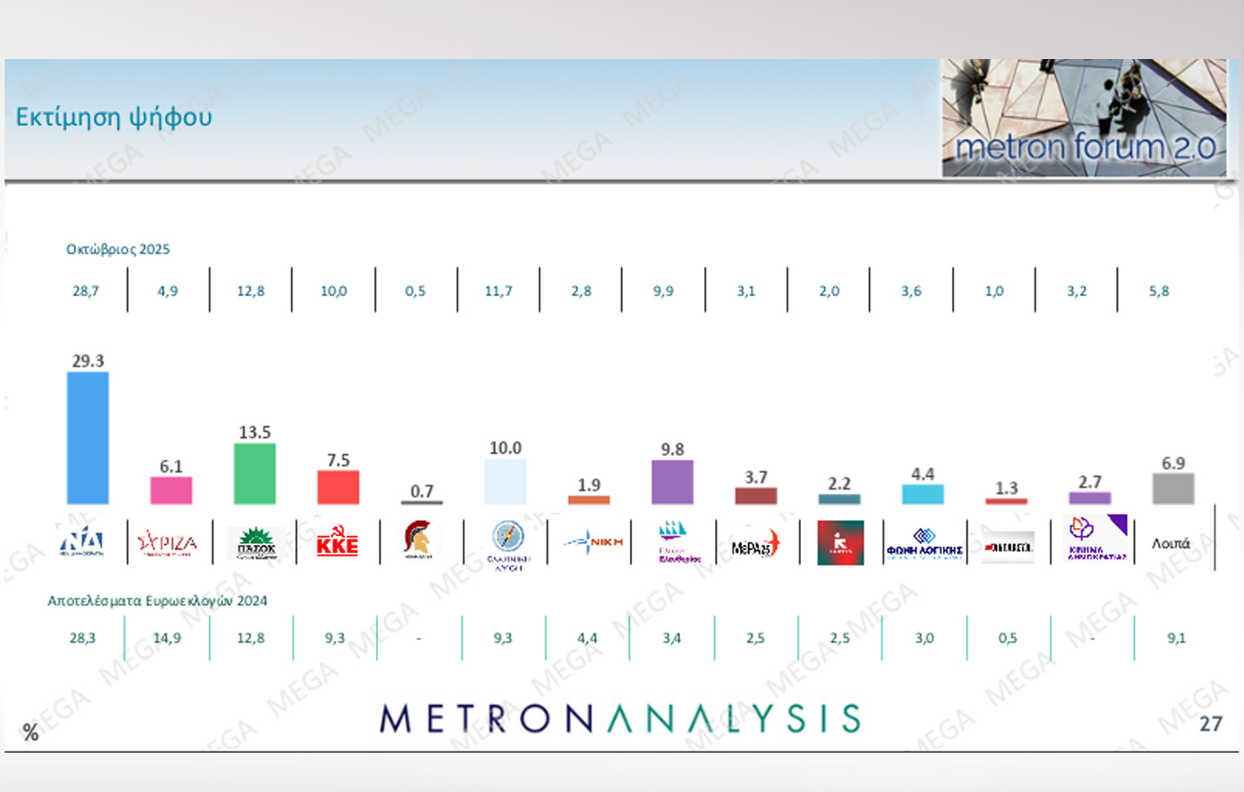 Η Metron Analysis στη δημοσκόπηση που πραγματοποίησε για το Mega έδωσε τη Νέα Δημοκρατία πρώτη με ποσοστό 29,3%, με το ΠΑΣΟΚ να βρίσκεται στη θέση της αξιωματικής αντιπολίτευσης.