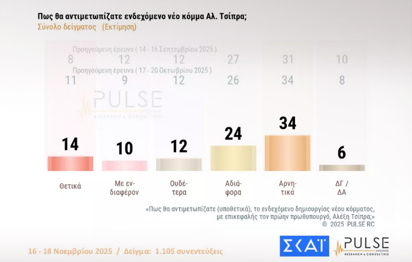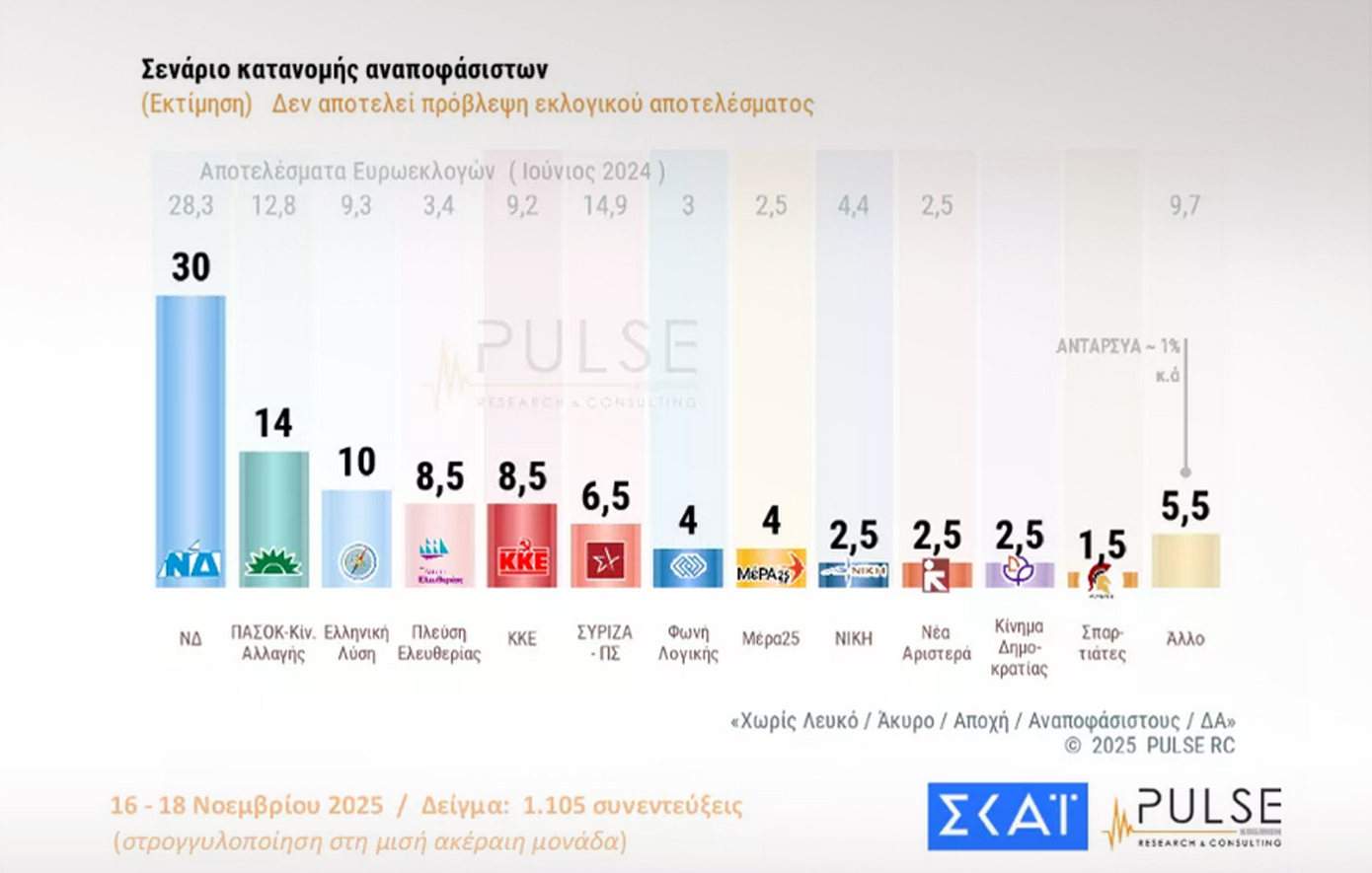 Παρόμοια εικόνα κατέγραψε και η δημοσκόπηση της Pulse για τον ΣΚΑΪ, με τα κόμματα να λαμβάνουν τα εξής ποσοστά: