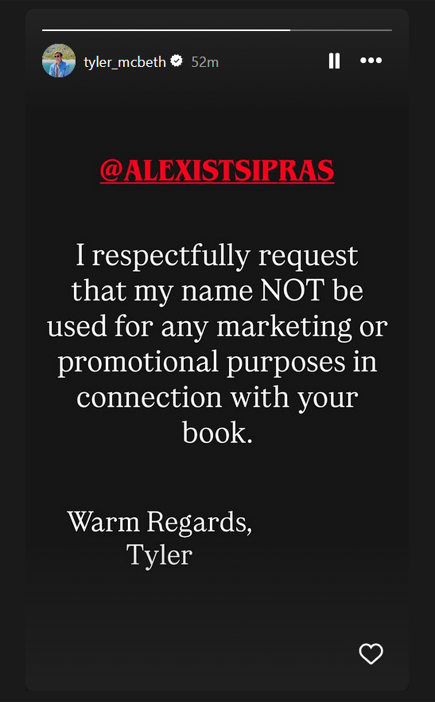 Ο Τάιλερ Μπακμπέθ ανέβασε σε στόρι στο Instagram ένα μήνυμα όπου σημειώνει: «Ζητώ με σεβασμό το όνομά μου να μην χρησιμοποιηθεί για οποιονδήποτε σκοπό σχετικό με μάρκετινγκ ή προώθηση σε σχέση με το βιβλίο σας». Μάλιστα, ο σύζυγος του Στέφανου Κασσελάκη ταγκάρει τον Αλέξη Τσίπρα.