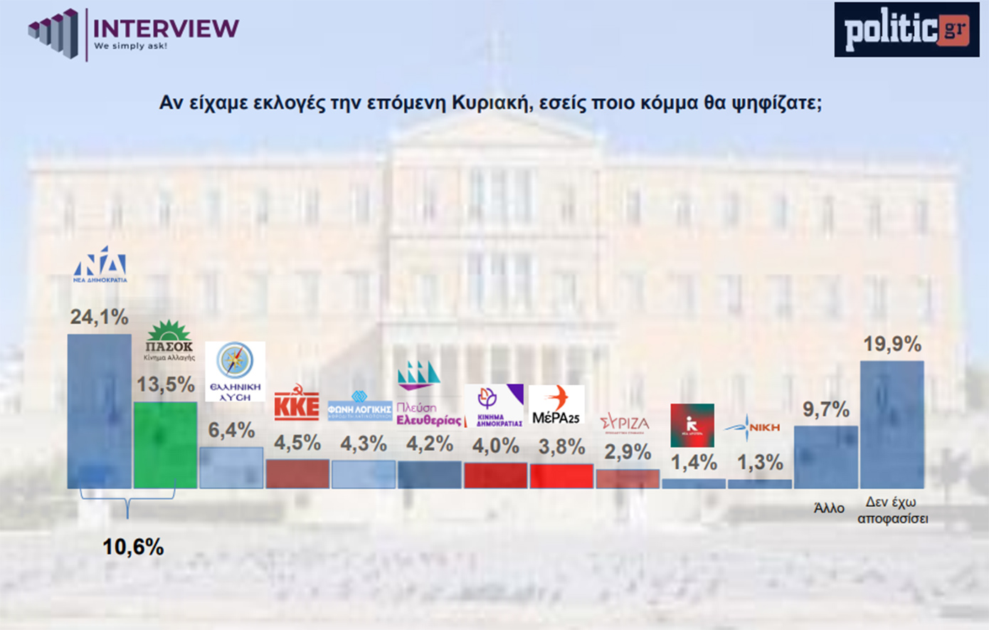 Στην πρόθεση ψήφου, η Νέα Δημοκρατία συγκεντρώνει 24,1% και παραμένει πρώτη δύναμη, χωρίς εμφανείς αποκλίσεις σε σχέση με προηγούμενες μετρήσεις. Το ΠΑΣΟΚ ανεβαίνει στο 13,5%, επιβεβαιώνοντας μια σταθερή παρουσία στη δεύτερη θέση.