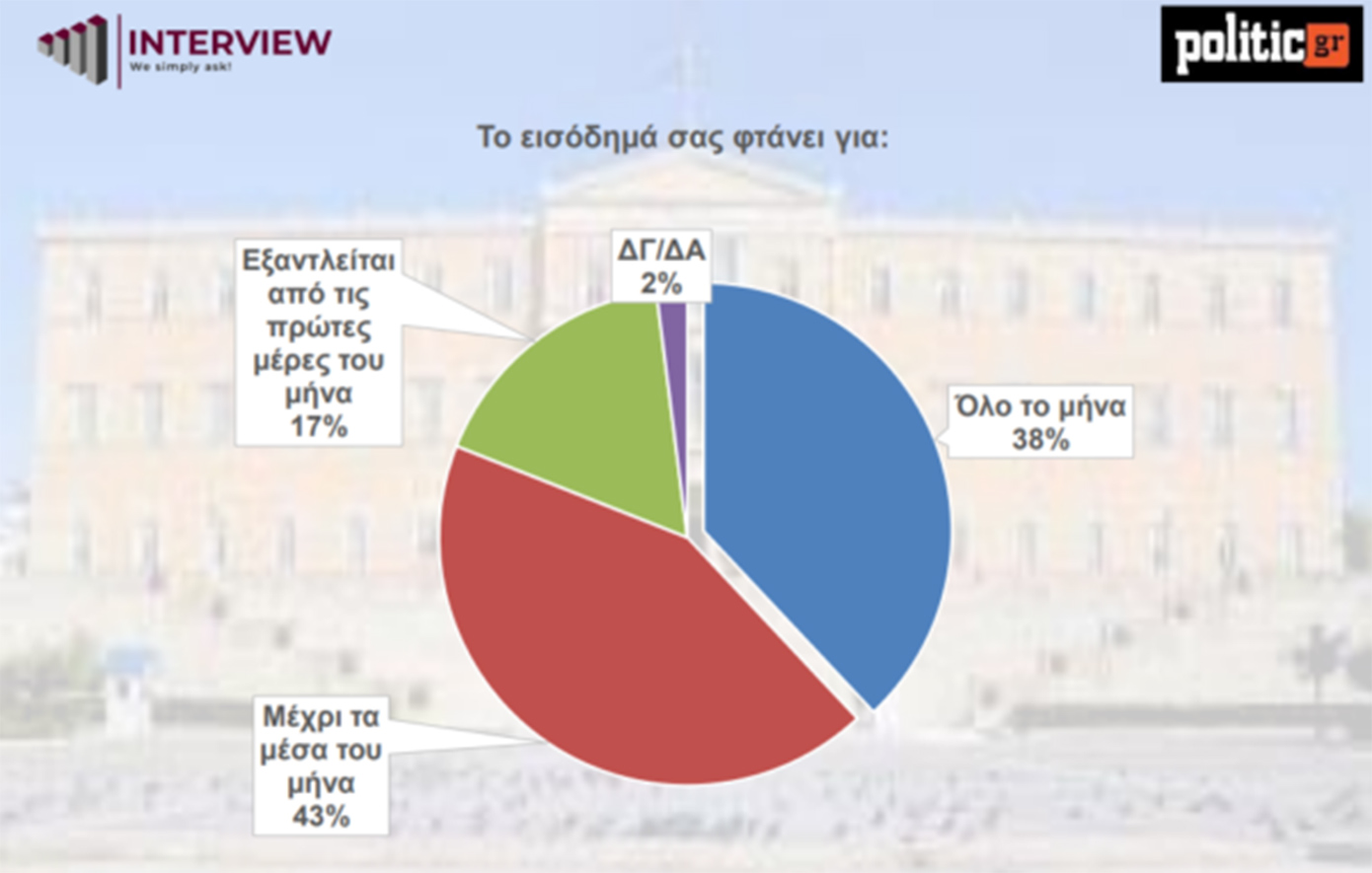 Το 43% δηλώνει ότι τα χρήματα φτάνουν μέχρι τα μέσα του μήνα, ενώ ένα 17% απαντά ότι εξαντλείται ήδη από τις πρώτες ημέρες. Μόνο το 38% αναφέρει ότι το εισόδημά του επαρκεί για ολόκληρο τον μήνα.