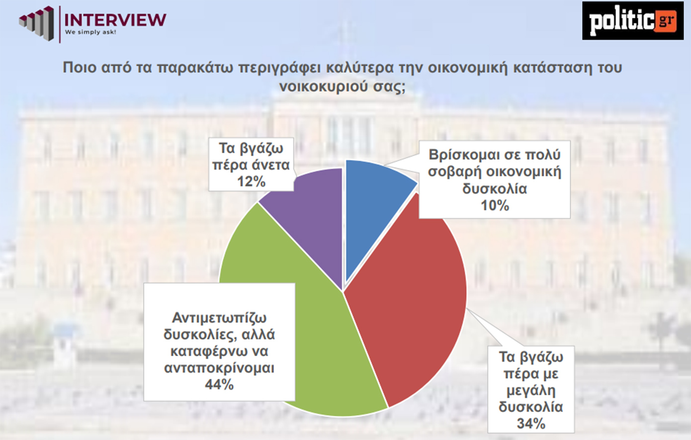 Το 10% των πολιτών δηλώνει ότι βρίσκεται σε πολύ σοβαρή οικονομική πίεση, ενώ ένα 34% αναφέρει ότι «τα βγάζει πέρα με μεγάλη δυσκολία». Επιπλέον, το 44% αντιμετωπίζει οικονομικές δυσκολίες αλλά καταφέρνει να ανταποκρίνεται. Αντίθετα, μόλις το 12% των συμμετεχόντων δηλώνει ότι τα βγάζει πέρα άνετα.