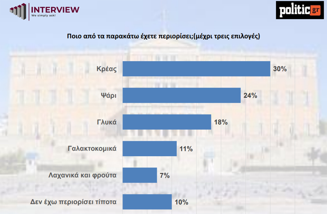 30% δηλώνει ότι έχει περιορίσει το κρέας, 24% το ψάρι, 18% τα γλυκά, 11% τα γαλακτοκομικά, και 7% ακόμη και τα φρούτα και λαχανικά. Μόλις 10% των ερωτηθέντων αναφέρει ότι δεν έχει περιορίσει κανένα είδος τροφίμου.