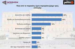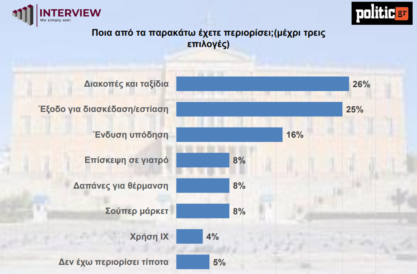 26% έχει περιορίσει διακοπές και ταξίδια, 25% τις εξόδους για διασκέδαση ή εστίαση, 16% τα έξοδα για ένδυση/υπόδηση.