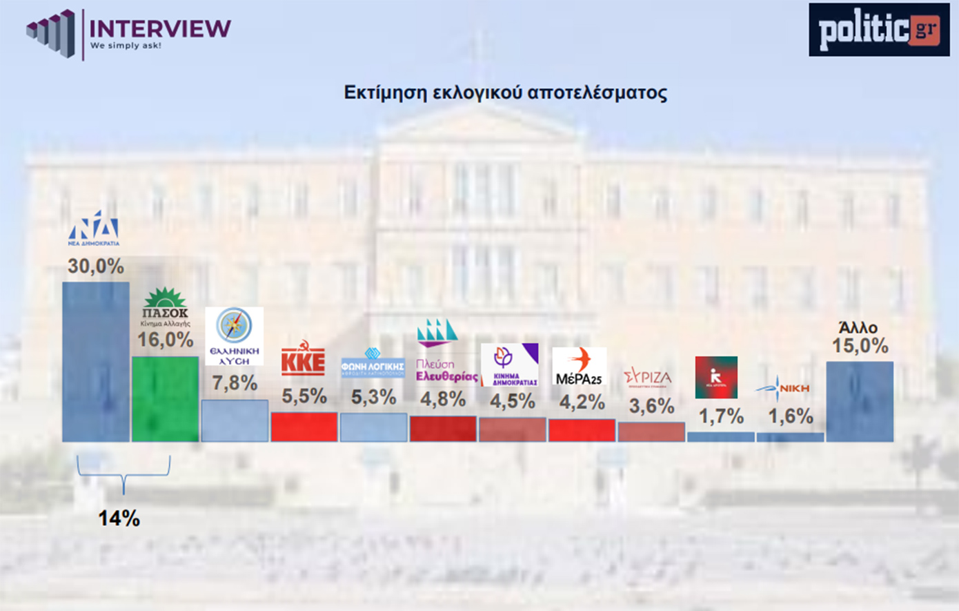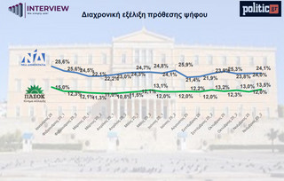 Πρώτη παραμένει η Νέα Δημοκρατία, σύμφωνα με νέα δημοσκόπηση της Interview που δημοσιεύεται σήμερα, Τρίτη 25/11, από την ιστοσελίδα politic.gr. Την ίδια ώρα, σχεδόν ένας στους πέντε ψηφοφόρους δηλώνει αναποφάσιστος.