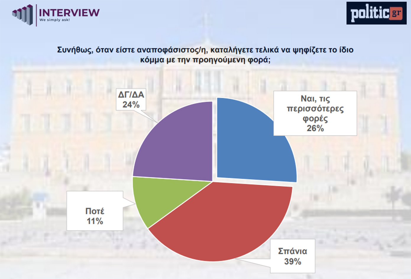 Η έρευνα δείχνει ότι ένα σημαντικό ποσοστό των αναποφάσιστων εμφανίζει τάση μετακινούμενης ψήφου, χωρίς σταθερή κομματική αναφορά. Το 39% δηλώνει ότι σπάνια επιστρέφει στο κόμμα που είχε επιλέξει στην προηγούμενη εκλογική αναμέτρηση, ενώ ένα 11% απαντά ότι δεν επιστρέφει ποτέ. Αντίθετα, το 26% αναφέρει ότι συνήθως καταλήγει στην ίδια επιλογή.