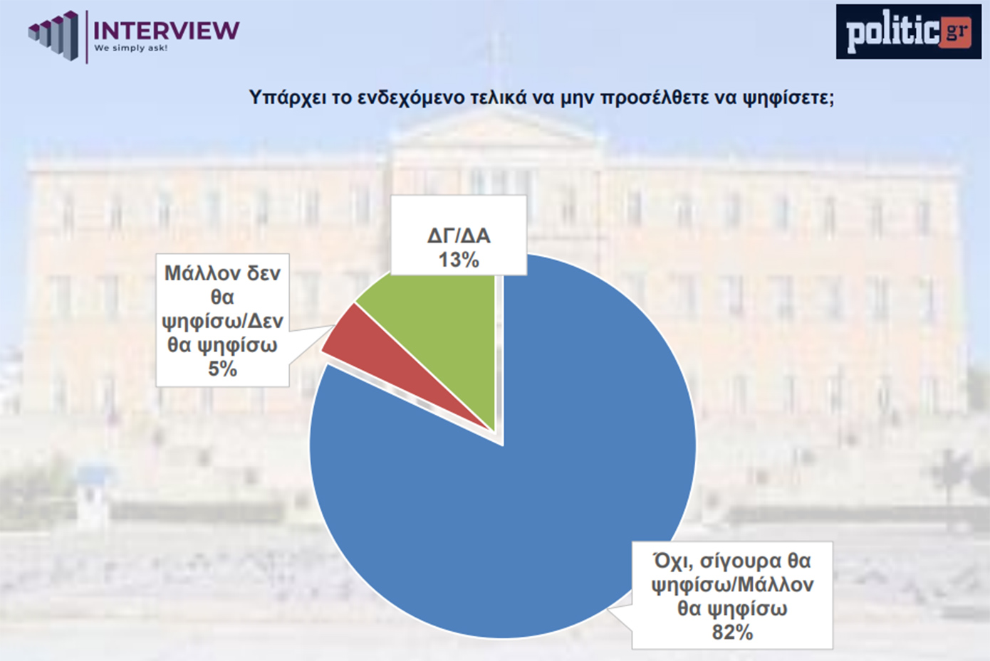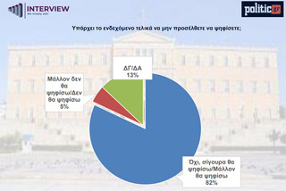 Παρά τη ρευστότητα, η συντριπτική πλειονότητα των αναποφάσιστων δηλώνει ότι θα προσέλθει στην κάλπη. Συγκεκριμένα, το 82% απαντά «σίγουρα» ή «μάλλον θα ψηφίσω». Μόνο ένα 5% αναφέρει ότι «μάλλον δεν θα ψηφίσει» ή «δεν θα ψηφίσει».