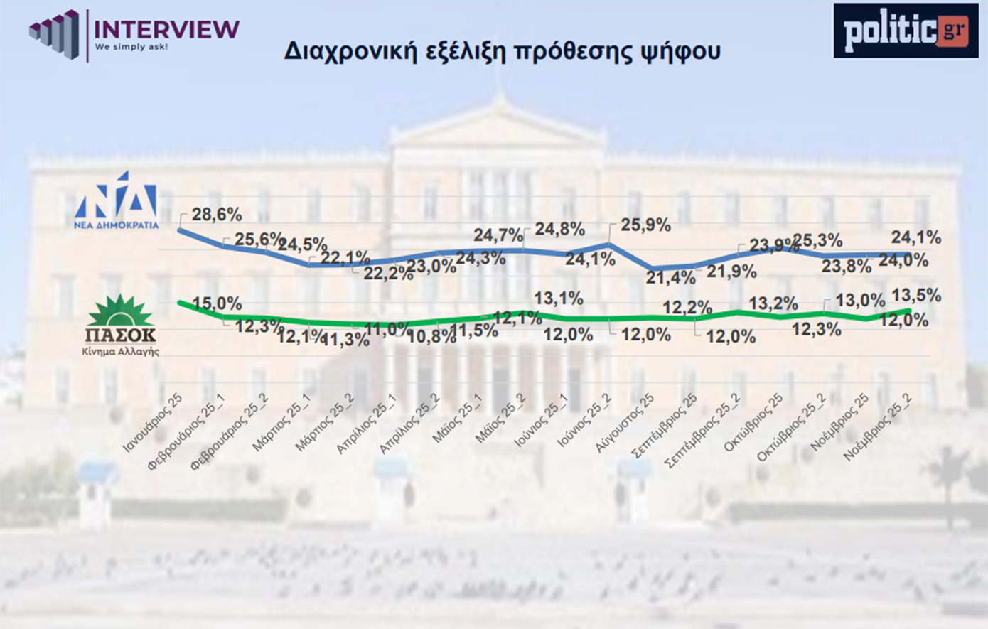 Η εικόνα της πρόθεσης ψήφου μέσα στο 2025 δείχνει μια σταθερή πορεία, που δεν φαίνεται να οφείλεται σε συγκυριακούς παράγοντες.