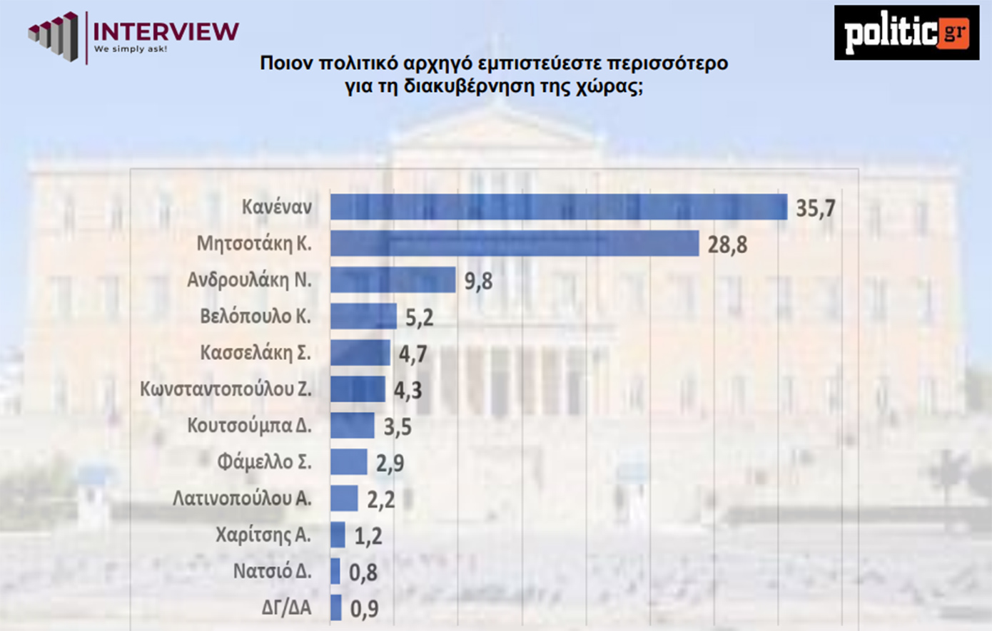 Το ερώτημα για την εμπιστοσύνη στους πολιτικούς αρχηγούς ενισχύει ακόμη περισσότερο την εικόνα επιφυλακτικότητας του εκλογικού σώματος. Η επιλογή «Κανέναν» καταγράφει 35,7%, αυξημένη σε σχέση με το 32,3% του προηγούμενου μήνα.