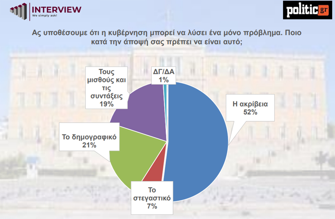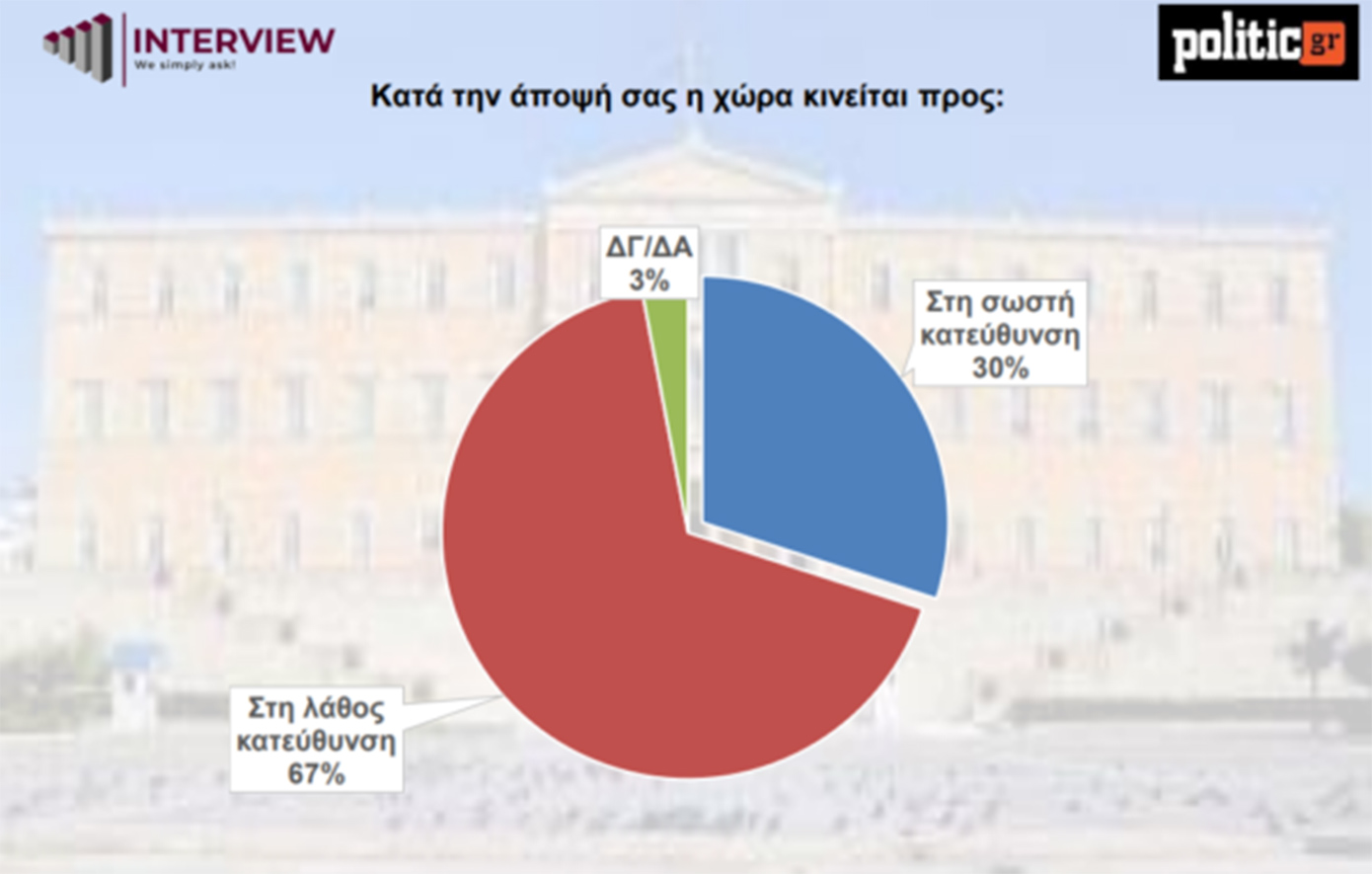 Στο ερώτημα για το αν η χώρα κινείται στη σωστή ή στη λάθος κατεύθυνση, το 67% απαντά ότι βρίσκεται σε λάθος τροχιά, ενώ το 30% δηλώνει ότι κινείται προς τη σωστή κατεύθυνση. Μάλιστα, σε ένα υποθετικό σενάριο όπου η κυβέρνηση μπορεί να λύσει μόνο ένα πρόβλημα, το 52% επιλέγει την ακρίβεια ως απόλυτη προτεραιότητα. Ακολουθούν το δημογραφικό (21%), οι μισθοί και συντάξεις (19%) και το στεγαστικό (7%).