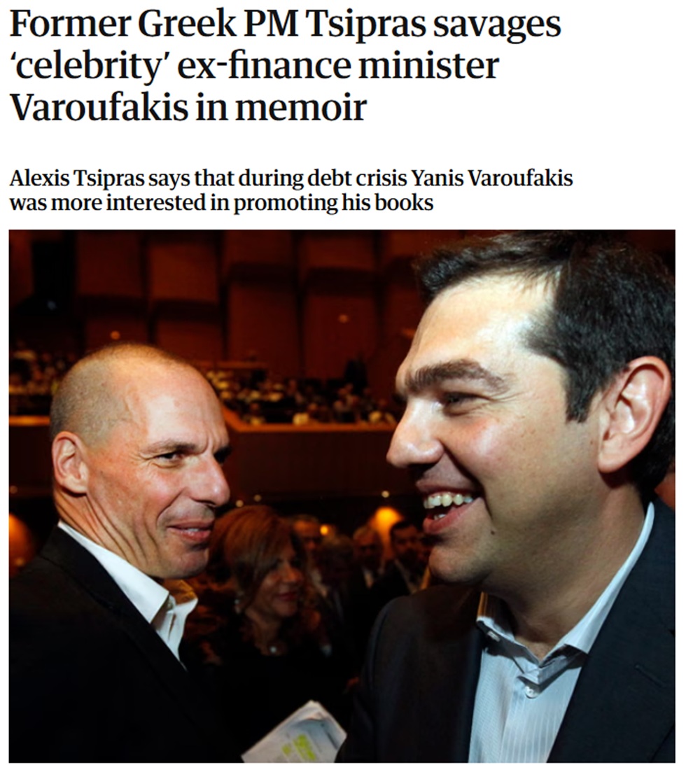 Πιο συγκεκριμένα αναφέρει: «Ο Γιάνης Βαρουφάκης, ο αιρετικός οικονομολόγος που έγινε παγκοσμίως γνωστός στην κορύφωση της ελληνικής κρίσης χρέους, δεν ήταν μόνο εγωκεντρικός αλλά, σύμφωνα με τον πρώην πρωθυπουργό, Αλέξη Τσίπρα, ενδιαφερόταν περισσότερο να δοκιμάσει τις θεωρίες παιγνίων του στη χώρα παρά να τη διασώσει.