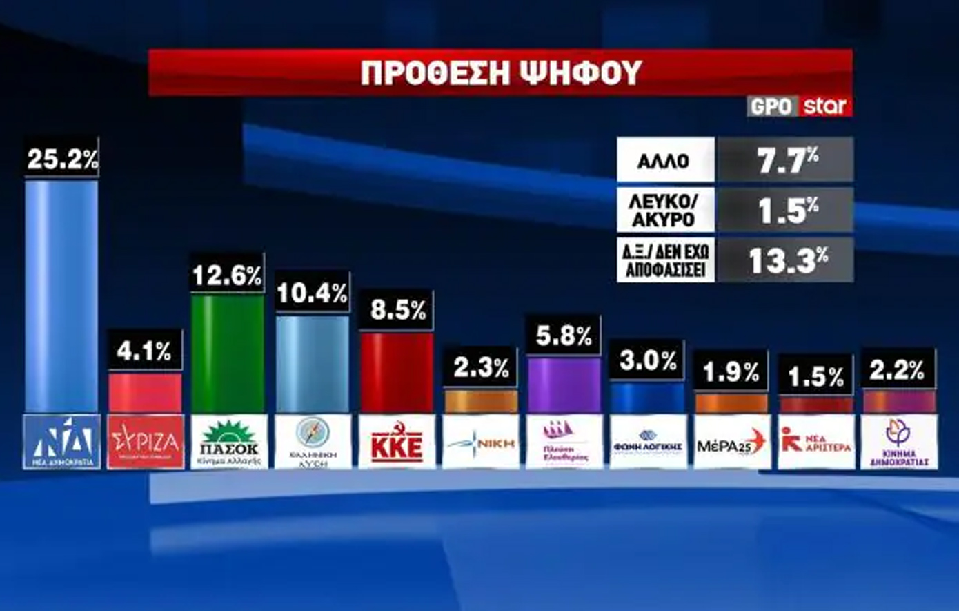 Πιο αναλυτικά, στην πρόθεση ψήφου η Νέα Δημοκρατία συγκεντρώνει 25,2%, δηλαδή διπλάσιο ποσοστό από το ΠΑΣΟΚ, που έρχεται δεύτερο και λαμβάνει 12,6%.