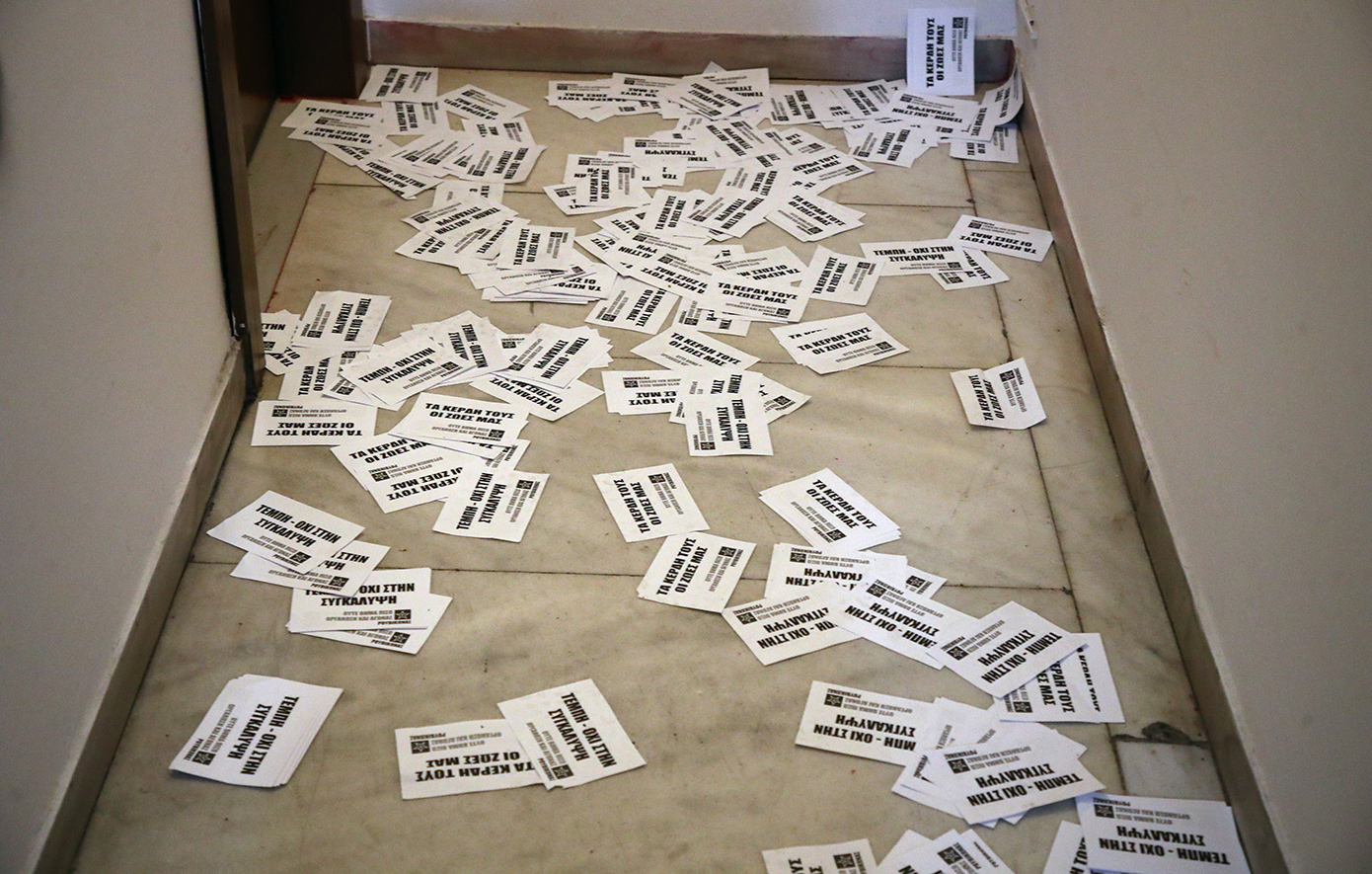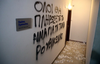 Η επίθεση είχε αποδοθεί στον «Ρουβίκωνα», που υπέγραφε τα φέιγ-βολάν με αναφορές για το σιδηροδρομικό δυστύχημα των Τεμπών.