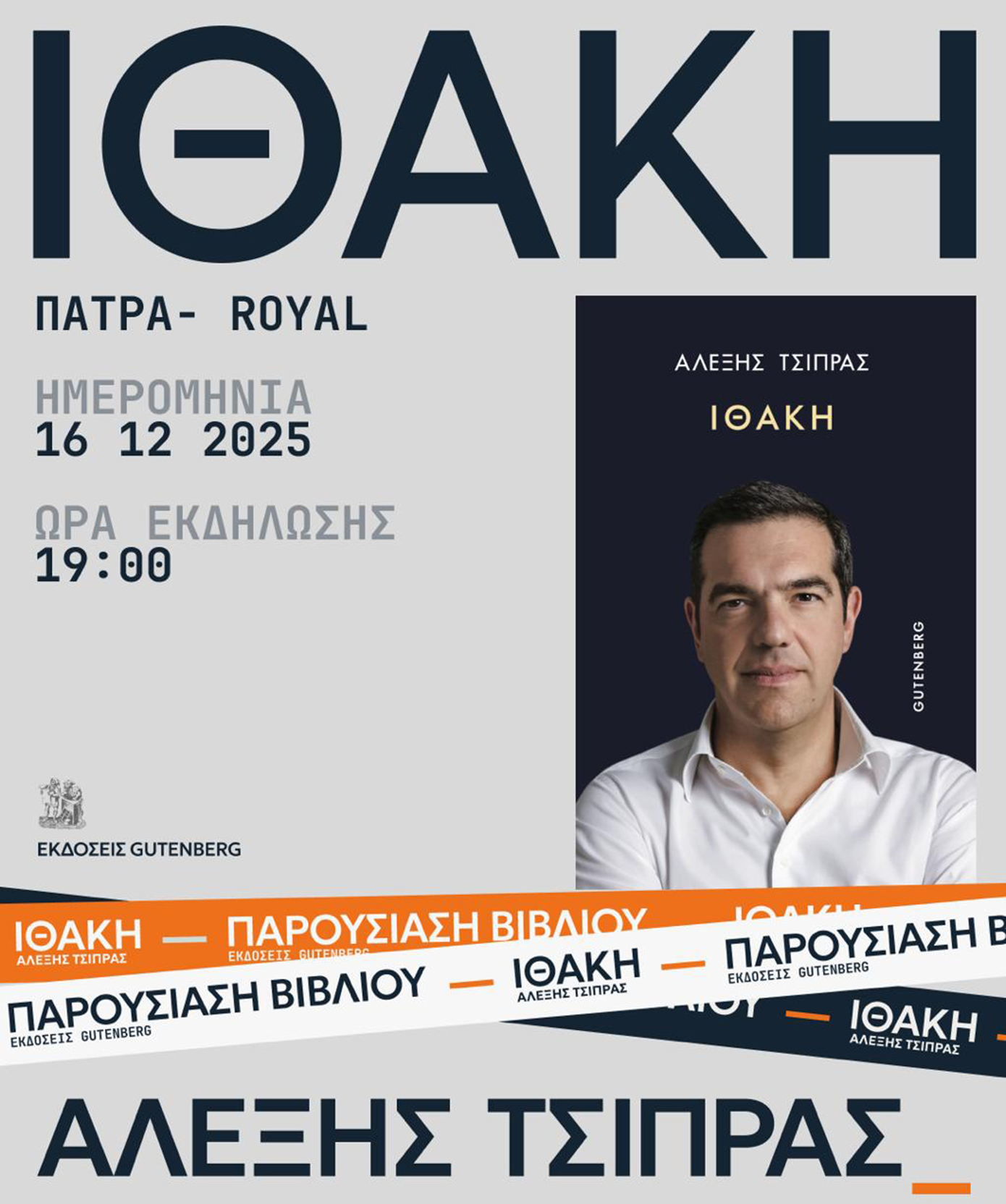 Την Τρίτη 16 Δεκεμβρίου θα πραγματοποιηθεί η παρουσίαση του βιβλίου του Αλέξη Τσίπρα «Ιθάκη», στην Πάτρα. Πρόκειται για τη δεύτερη πόλη όπου παρουσιάζεται το βιβλίο του πρώην πρωθυπουργού, μετά την Αθήνα.