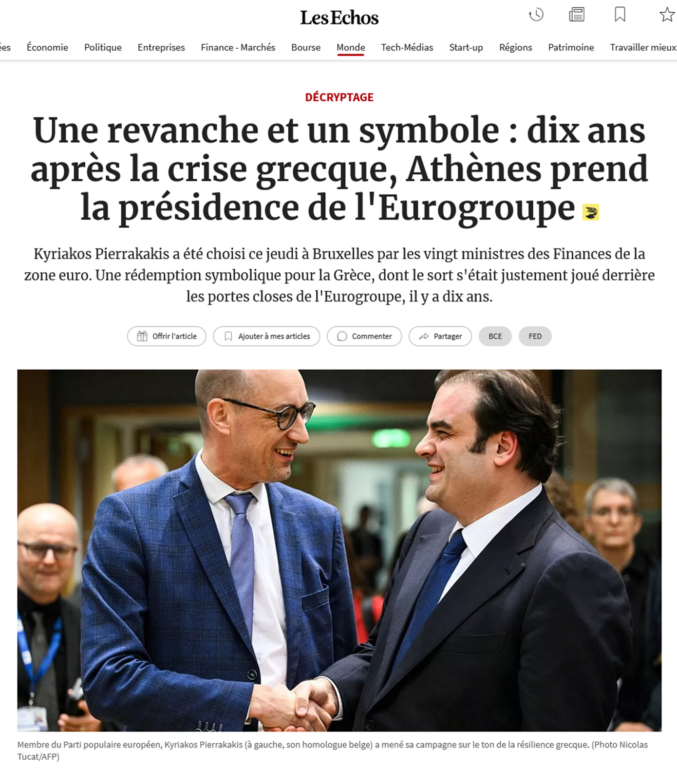 «Δέκα χρόνια μετά, αφού παραλίγο να εκδιωχθεί από τη ζώνη του ευρώ, η Ελλάδα παίρνει τη ρεβάνς της: ο υπουργός Οικονομικών της, Κυριάκος Πιερρακάκης, εξελέγη την Πέμπτη από τους ομολόγους του επικεφαλής του οργάνου που τη διοικεί, του Eurogroup», γράφει η Le Monde.