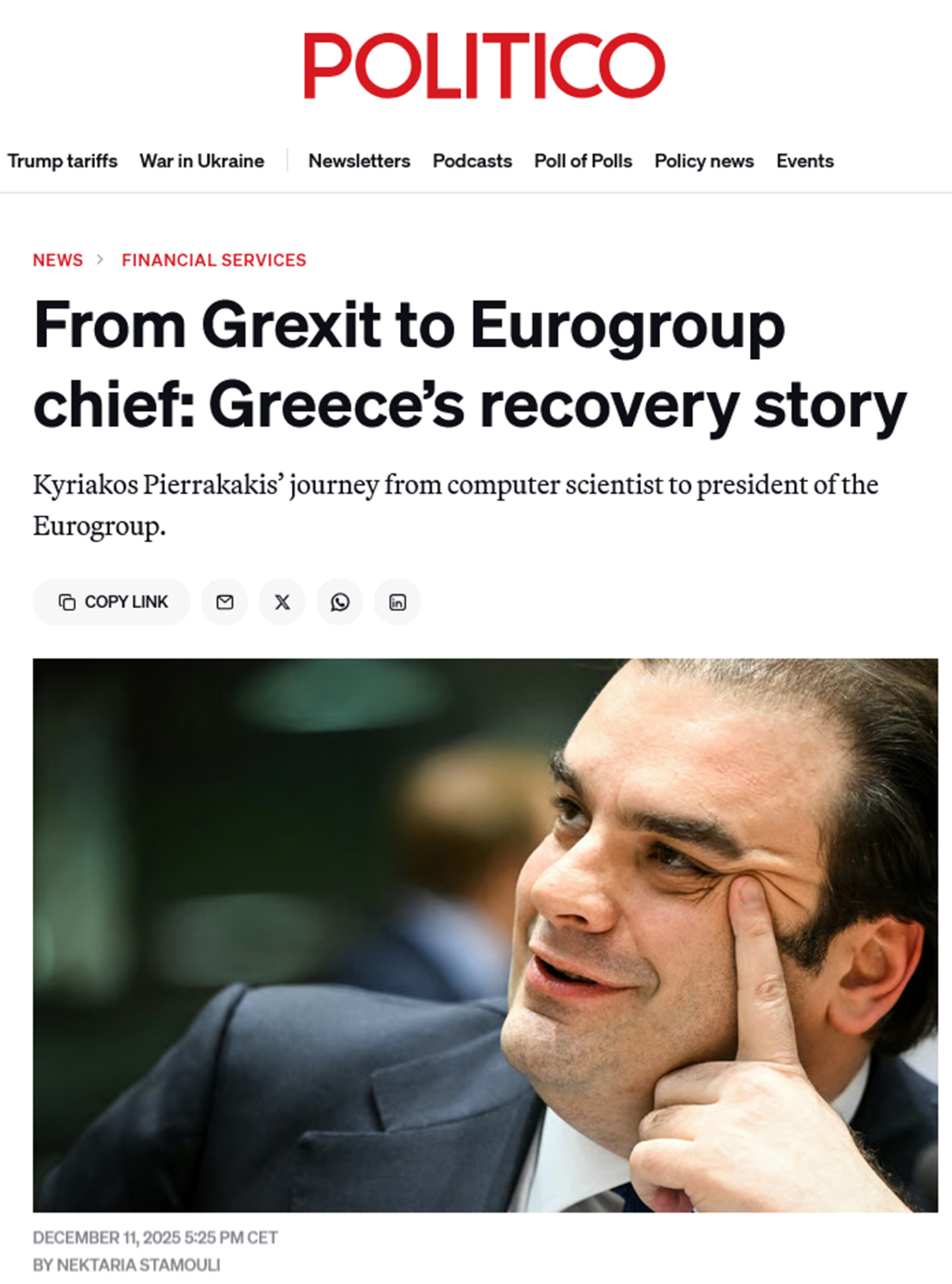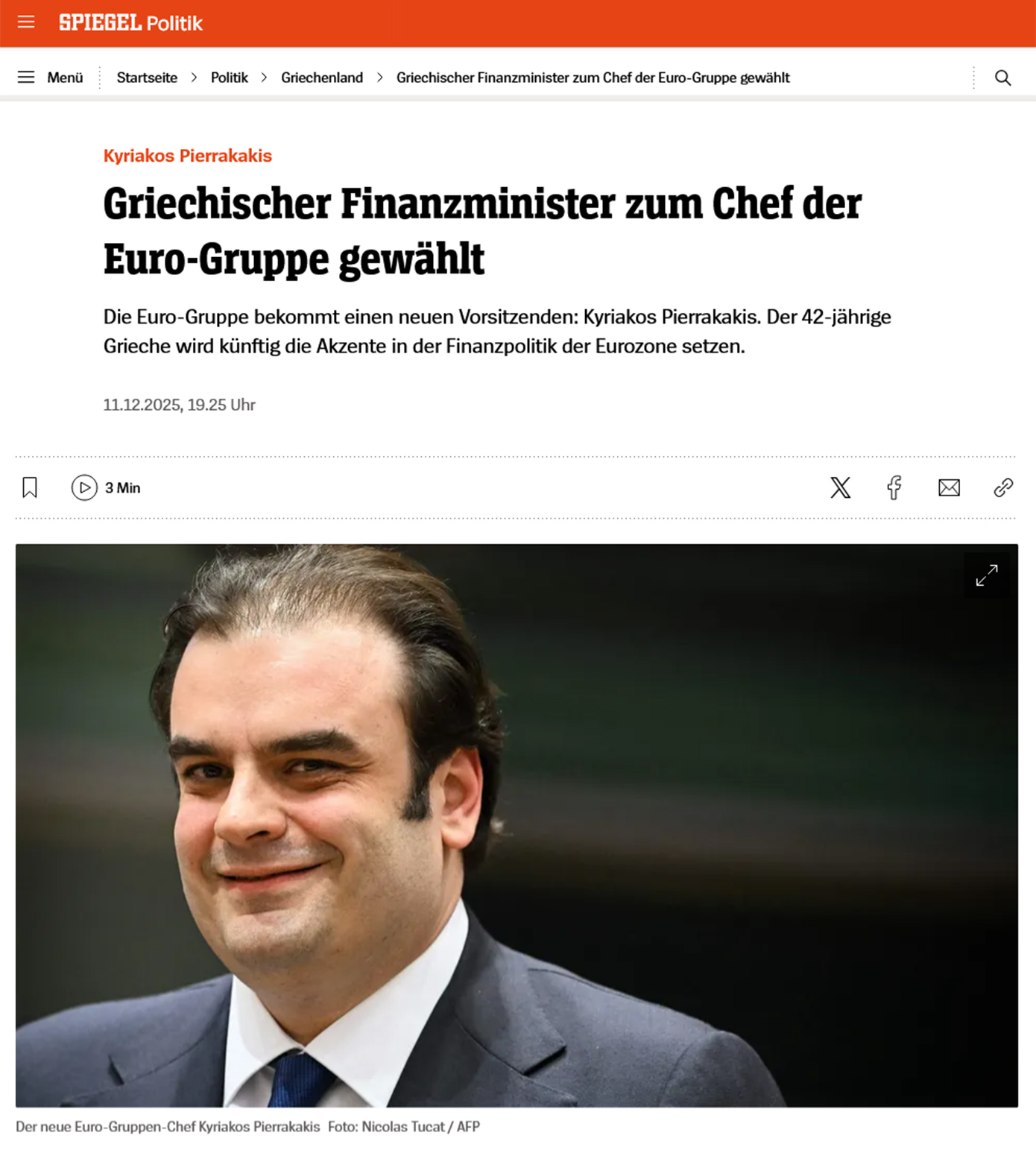 «Ο Κυριάκος Πιερρακάκης εξελέγη αυτή την Πέμπτη στις Βρυξέλλες από τους είκοσι υπουργούς Οικονομικών της ευρωζώνης. Μια συμβολική εξιλέωση για την Ελλάδα, της οποίας η τύχη αποφασίστηκε πίσω από τις κλειστές πόρτες της Ευρωομάδας πριν από δέκα χρόνια», προστίθεται στο δημοσίευμα.