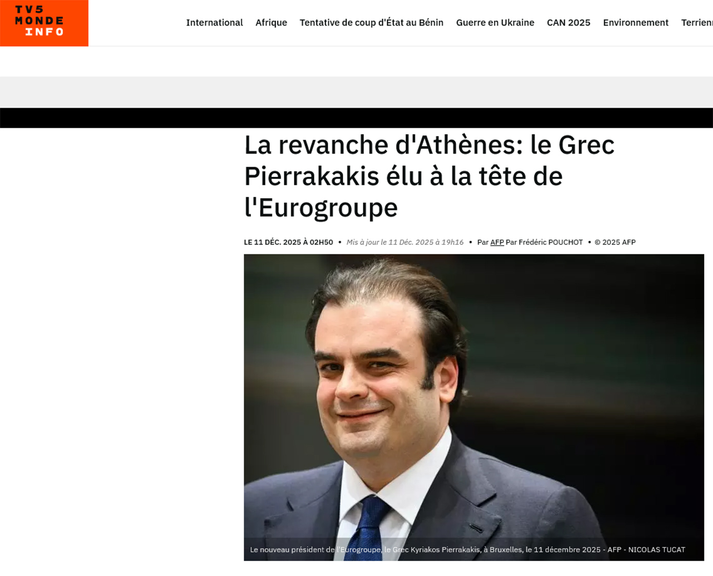 Το Euronews παρουσιάζει την εκλογή ως αναγνώριση της μεταρρυθμιστικής προσπάθειας της χώρας, τονίζοντας ότι οι υπουργοί Οικονομικών της Ευρωζώνης είδαν στο πρόσωπο του Πιερρακάκη «ένα θετικό αφήγημα για την Ένωση». Υπενθυμίζει ότι η Ελλάδα, δέκα χρόνια μετά το ενδεχόμενο Grexit, επιστρέφει με πρωταγωνιστικό ρόλο σε ένα από τα σημαντικότερα θεσμικά φόρα της Ευρώπης.
