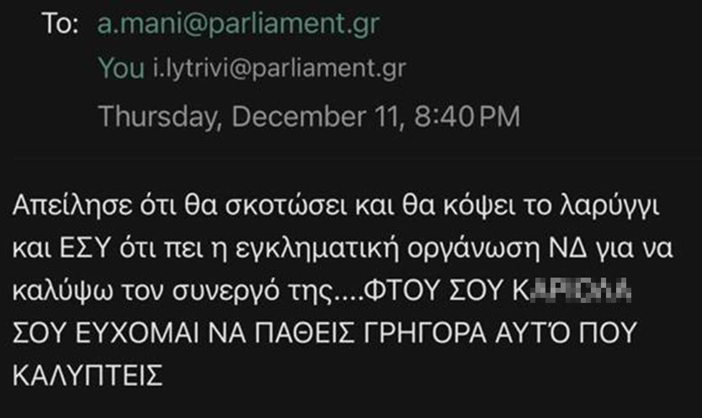 Ειδικότερα, όπως αναφέρουν οι ίδιες πηγές, τα απειλητικά μηνύματα που έχουν αποσταλεί σε βουλευτές της Νέας Δημοκρατίας «συνιστούν ανοιχτές και ωμές απειλές κατά της ανθρώπινης ζωής, με αναφορές σε δολοφονία και ακρωτηριασμό. Πρόκειται για ακραίες, εγκληματικού χαρακτήρα πρακτικές που δεν έχουν καμία θέση σε μια δημοκρατική χώρα».