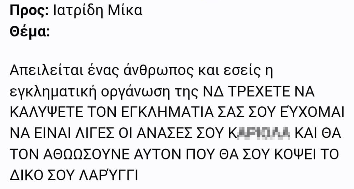 «Εάν συμβεί το παραμικρό σε βουλευτή της Νέας Δημοκρατίας, η πολιτική και ηθική ευθύνη θα βαραίνει πλήρως και προσωπικά την κυρία Ζωή Κωνσταντοπούλου. Η διαρκής τοξική ρητορική της και η θεσμική της εκτροπή λειτουργούν ως πολλαπλασιαστής τέτοιων απειλών.