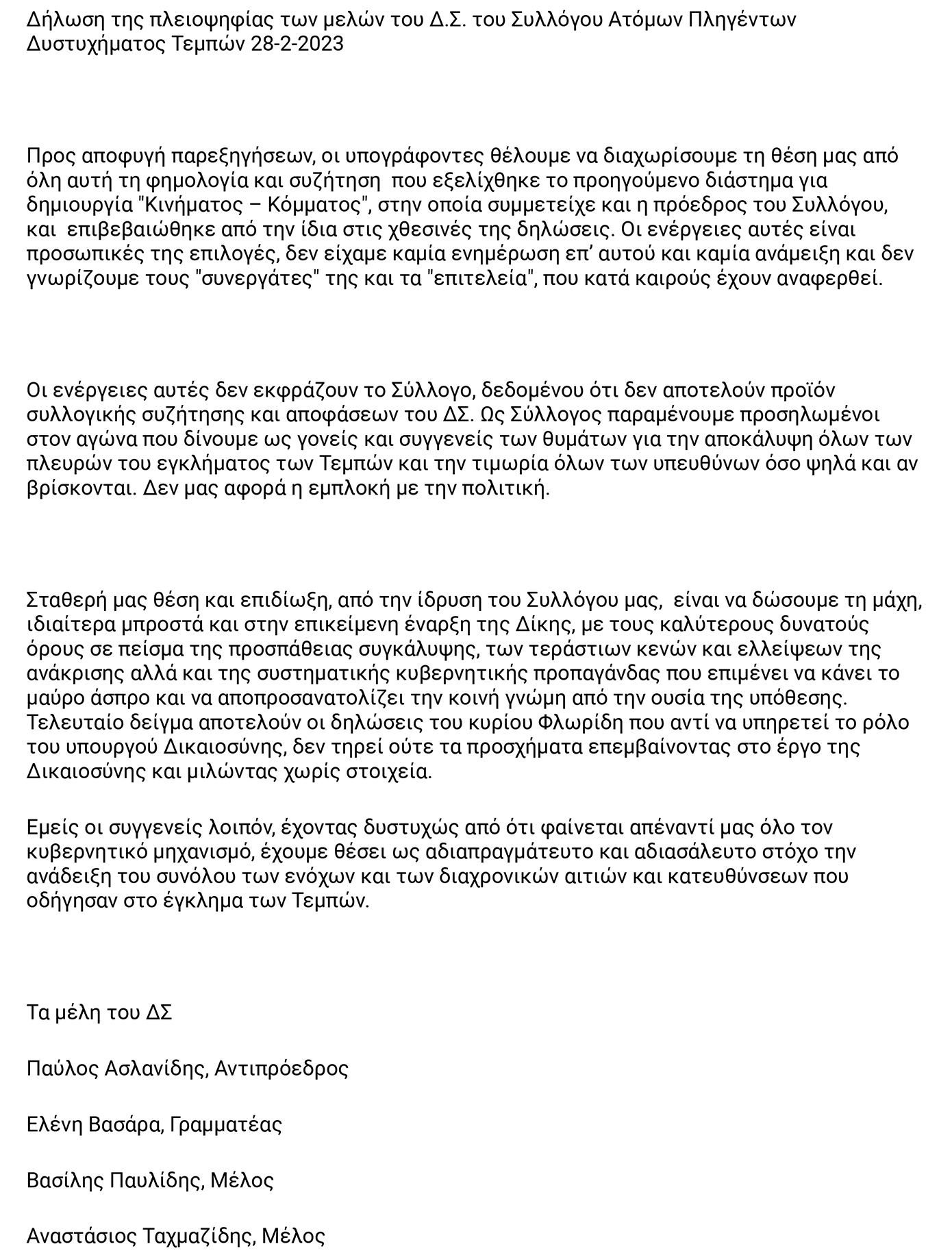 Οι ενέργειες αυτές δεν εκφράζουν το Σύλλογο, δεδομένου ότι δεν αποτελούν προϊόν συλλογικής συζήτησης και αποφάσεων του ΔΣ. Ως Σύλλογος παραμένουμε προσηλωμένοι στον αγώνα που δίνουμε ως γονείς και συγγενείς των θυμάτων για την αποκάλυψη όλων των πλευρών του εγκλήματος των Τεμπών και την τιμωρία όλων των υπευθύνων όσο ψηλά και αν βρίσκονται. Δεν μας αφορά η εμπλοκή με την πολιτική.