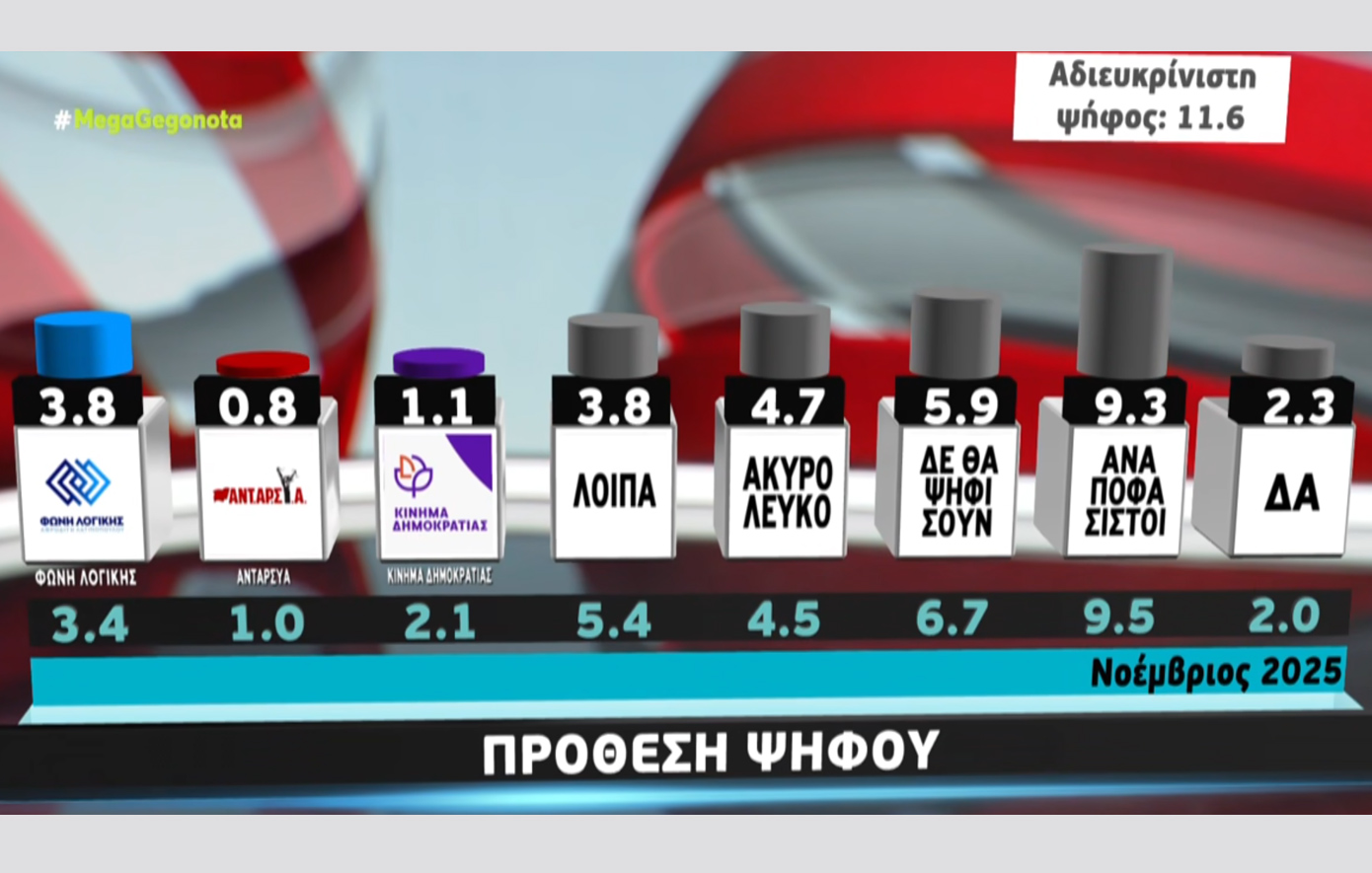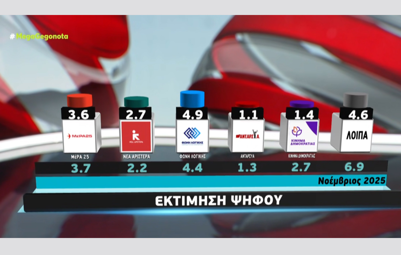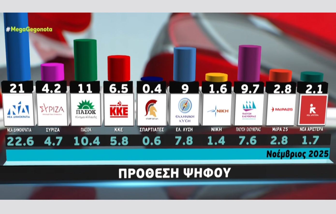 Η Metron Analysis πραγματοποίησε νέα δημοσκόπηση για το Mega, με τη Νέα Δημοκρατία να παραμένει πρώτη, το ΠΑΣΟΚ δεύτερο, αλλά δείχνοντας ότι μπορεί να αυξήσει λίγο τα ποσοστά του, ενώ υπάρχει και έκπληξη με τον Αλέξη Τσίπρα.