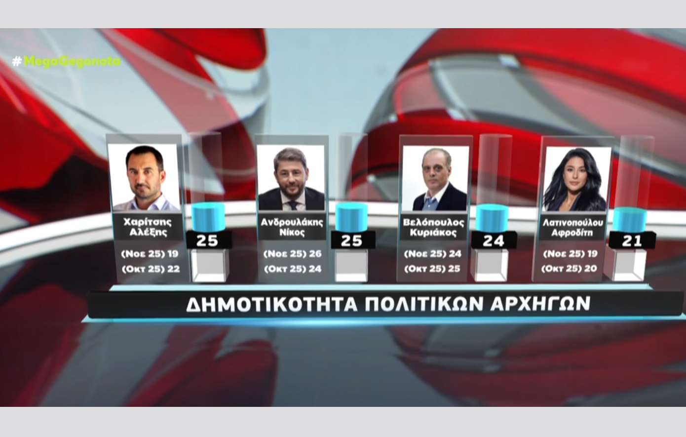 Σε ό,τι αφορά τη δημοτικότητα των πολιτικών αρχηγών, τα ποσοστά τους διαμορφώνονται ως εξής: