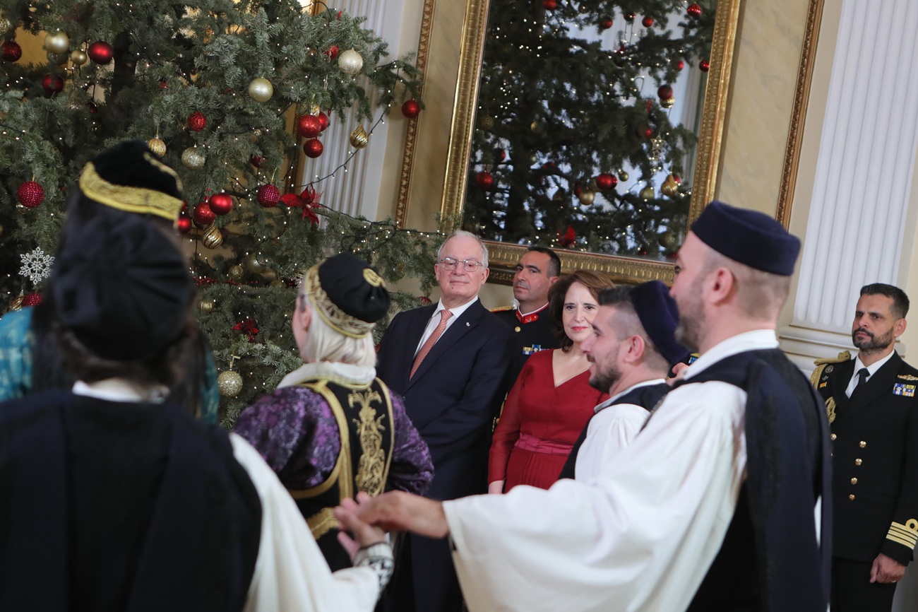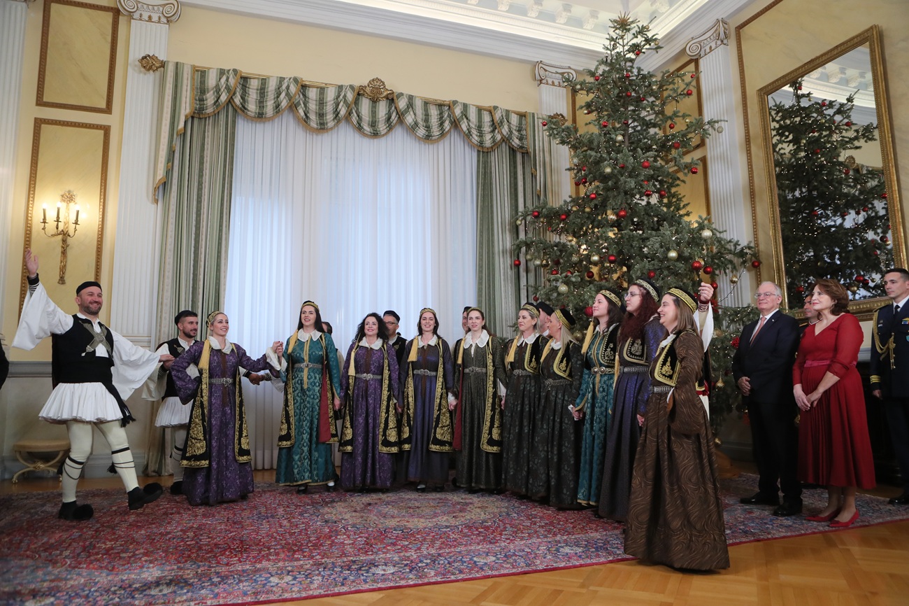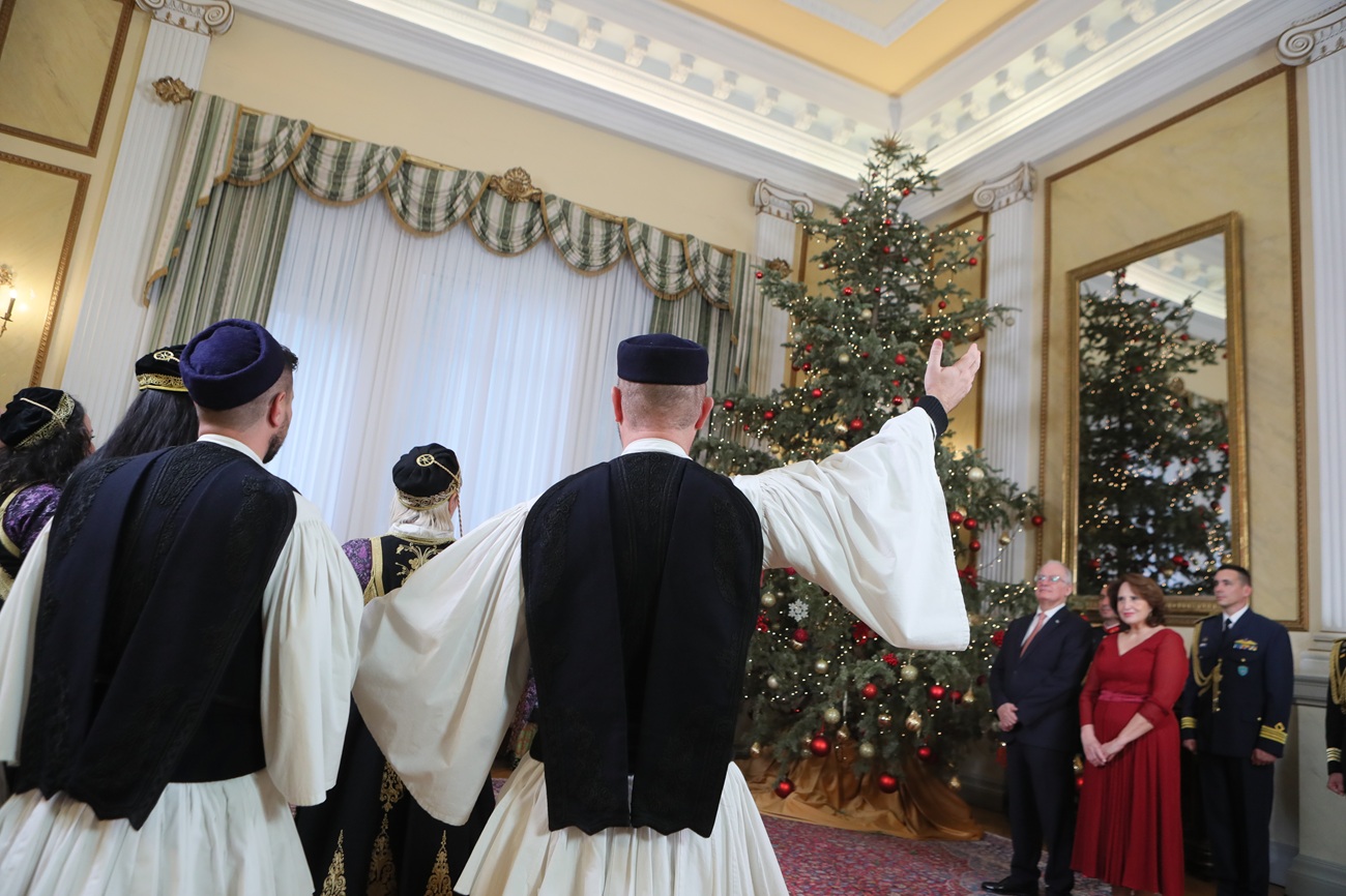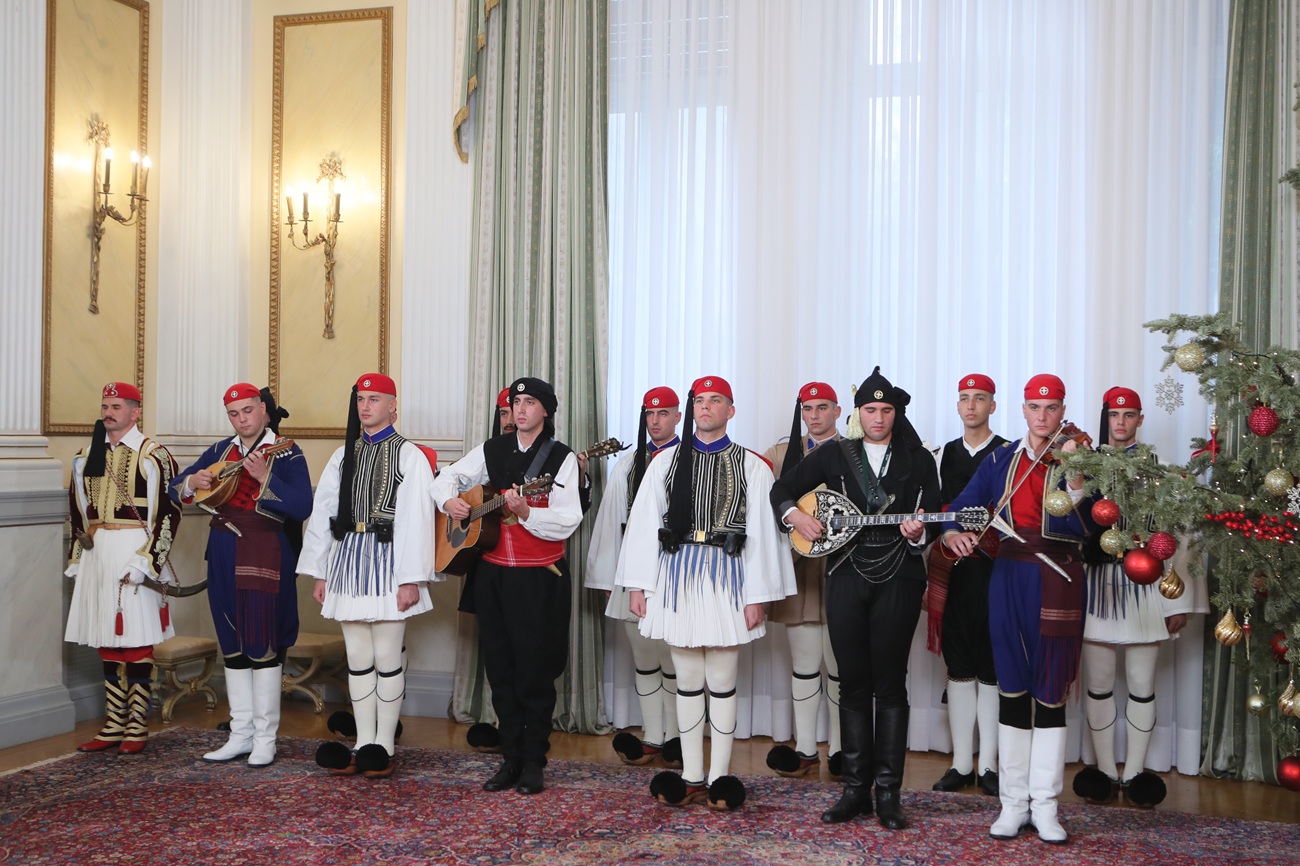 Η μπάντα των Ενόπλων Δυνάμεων και η Προεδρική Φρουρά έψαλαν τα κάλαντα των Χριστουγέννων στον Πρόεδρο της Δημοκρατίας Κωνσταντίνο Αν. Τασούλα και τη σύζυγό του Φανή Σταθοπούλου.