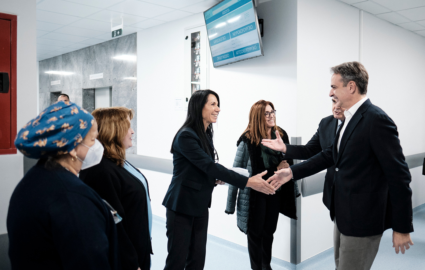 Ο Κυριάκος Μητσοτάκης είχε την ευκαιρία να συνομιλήσει με το ιατρικό, νοσηλευτικό και διοικητικό προσωπικό καθώς και με ασθενείς για τις μεταρρυθμίσεις και τα έργα που υλοποιούνται στο Εθνικό Σύστημα Υγείας για την αναβάθμιση των παρεχόμενων υπηρεσιών, τη βελτίωση της εξυπηρέτησης των πολιτών καθώς και των συνθηκών εργασίας.