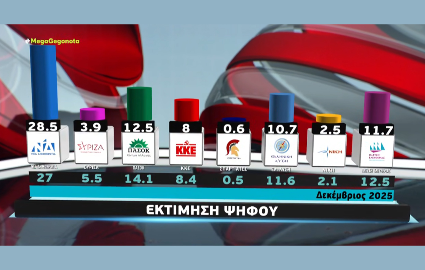 Στην εκτίμηση ψήφου η Νέα Δημοκρατία προηγείται με 28,5% με δεύτερο κόμμα το ΠΑΣΟΚ με 12,5% και την Πλεύση Ελευθερίας να ακολουθεί με 11,7%.