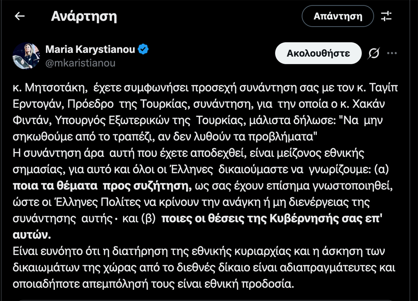 Ειδικότερα, σε ανάρτηση που έκανε στο X, η κ. Καρυστιανού αναφέρει ότι η συνάντηση του Έλληνα πρωθυπουργού με τον πρόεδρο της Τουρκίας αποκτά ιδιαίτερη βαρύτητα μετά τις δηλώσεις του υπουργού Εξωτερικών της γείτονος Χακάν Φιντάν, που ανέφερε ότι «δεν πρέπει να σηκωθούμε από το τραπέζι αν δεν λυθούν τα προβλήματα».