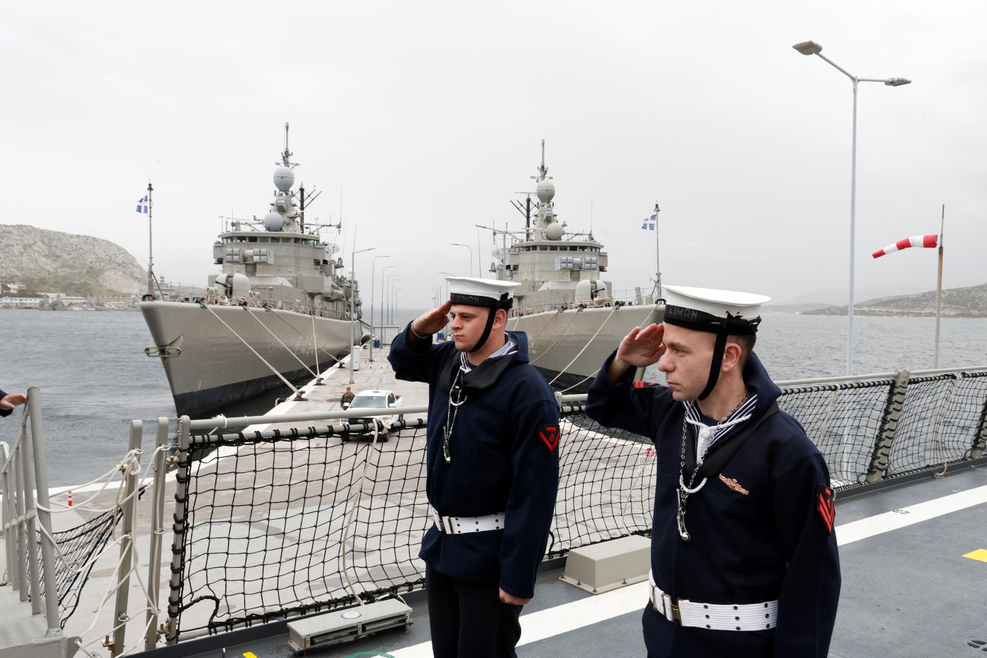 Λίγο πριν τις 11 η Γαλλίδα επίσημη και ο Έλληνας υπουργός έφτασαν στον ναύσταθμο Σαλαμίνας και επιθεώρησαν τα τιμητικά αγήματα.