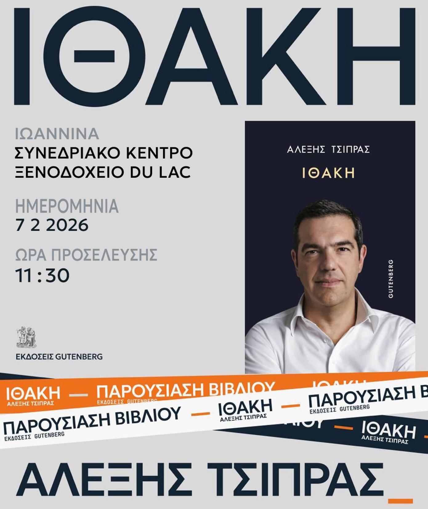 Το Σάββατο 7 Φεβρουαρίου παρουσιάζεται στο Συνεδριακό Κέντρο – Ξενοδοχείο Du Lac στα Ιωάννινα (Κ. Παπούλια & Ίκκου) το βιβλίο «Ιθάκη» του πρώην πρωθυπουργού Αλέξη Τσίπρα, το οποίο κυκλοφορεί από τις εκδόσεις Gutenberg.