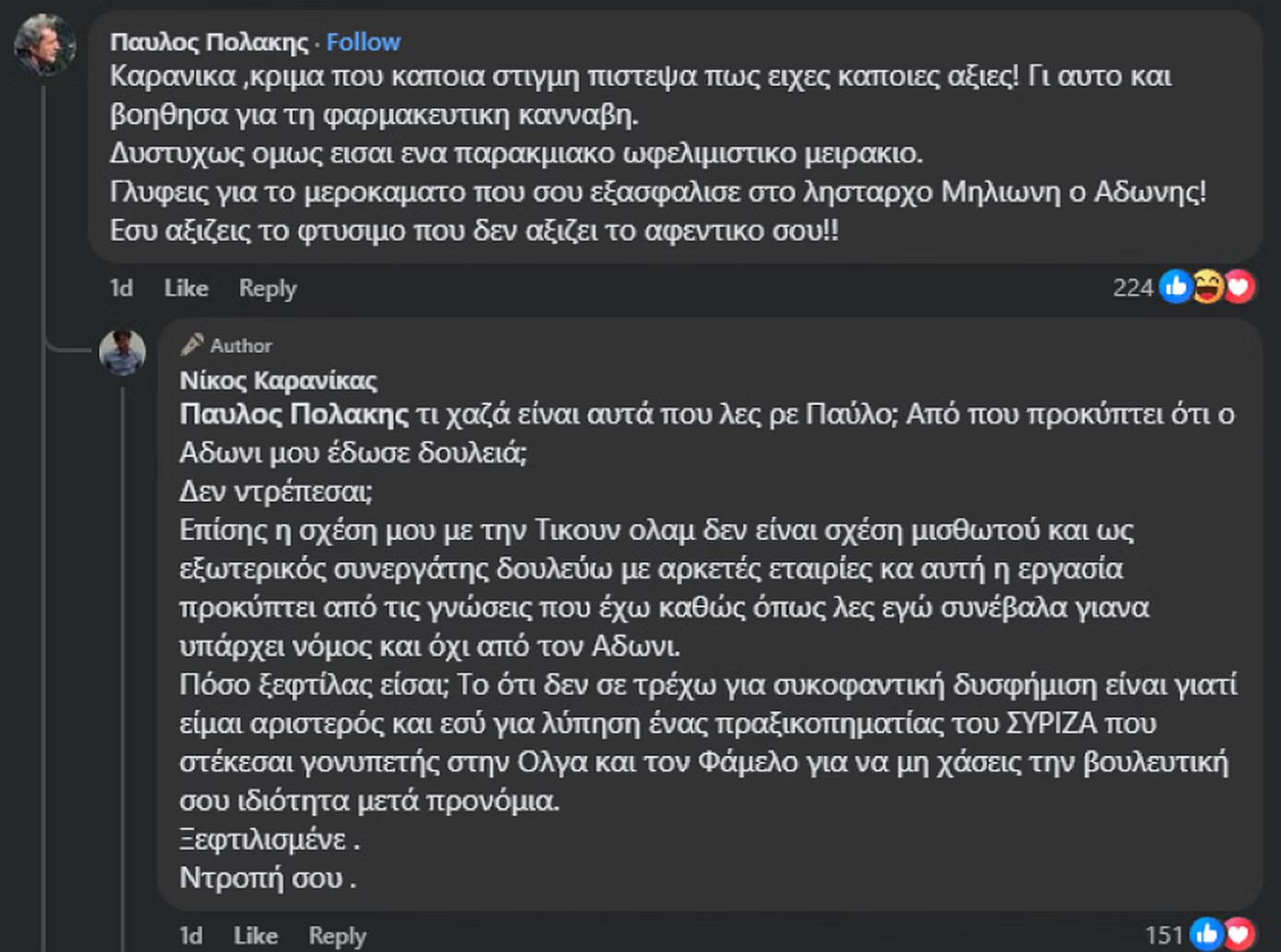 Καταλήγοντας ο Καρανίκας αποκάλεσε τον Παύλο Πολάκη ως «πραξικοπηματία και ξεφτιλισμένο», καλώντας τον να αναλογιστεί τα όσα γράφει.