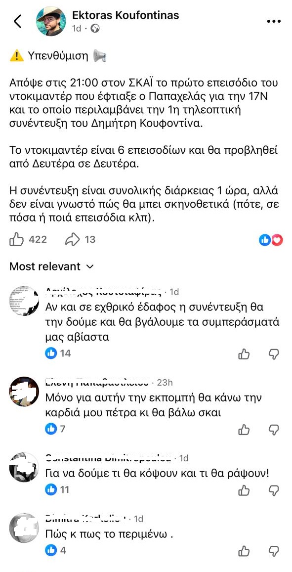 Αν προκάλεσε εντύπωση στους περισσότερους η ενθάρρυνση του Έκτορα Κουφοντίνα να παρακολουθήσουν οι ακόλουθοί του στα social media το ντοκιμαντέρ του ΣΚΑΪ και του Αλέξη Παπαχελά για τη 17Ν, στους συγγενείς των θυμάτων προκάλεσε οργή. Δεν ήταν τιμητικό για το κανάλι του Φαλήρου η πρόσκληση αυτή, έμαθα πως έλεγαν άνθρωποι που γνώρισαν με τον χειρότερο και σκληρότερο τρόπο τι σημαίνει τρομοκρατία στην Ελλάδα.