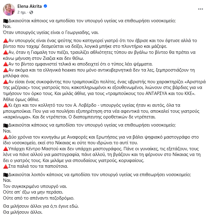 Η Έλενα Ακρίτα είχε προκαλέσει αίσθηση με κείμενό της στα social media, όπου απαντώντας στο ερώτημα αν δικαιούται κάποιος να εμποδίσει τον υπουργό, έγραψε μεταξύ άλλων: «Δικαιούται κάποιος να εμποδίσει τον υπουργό υγείας να επιθεωρήσει νοσοκομείο; Ναι. Τον συγκεκριμένο υπουργό ναι. Ούτε απ’ έξω να μην περάσει. Ούτε από το απέναντι πεζοδρόμιο».
