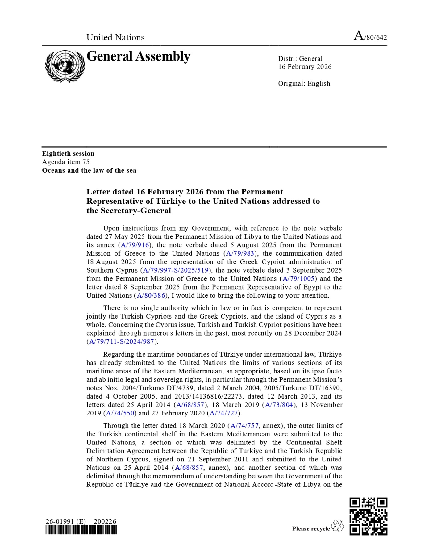 «Η από 16 Φεβρουαρίου 2026 επιστολή του Μονίμου Αντιπροσώπου της Τουρκίας στα Ηνωμένα Έθνη προς τον Γενικό Γραμματέα του Οργανισμού, σε συνέχεια σχετικών Ρηματικών Διακοινώσεων της Ελλάδας, της Κύπρου και της Αιγύπτου, ήταν εν πολλοίς αναμενόμενη και δεν προκαλεί έκπληξη. Η εν λόγω επιστολή, που απορρίπτεται εκ μέρους της Ελλάδας και θα απαντηθεί δεόντως, αναπαράγει τις γνωστές πλην όμως ευφάνταστες και αυθαίρετες ερμηνείες του Διεθνούς Δικαίου, και ειδικότερα του Δικαίου της Θάλασσας, στις οποίες συχνά επιδίδεται η Τουρκία, αμφισβητώντας, για μια ακόμη φορά, τα νόμιμα δικαιώματα της χώρας μας, ενώ επιμένει να μην αναγνωρίζει την Κυπριακή Δημοκρατία, κράτος μέλος της ΕΕ και του ΟΗΕ» αναφέρουν χαρακτηριστικά οι ελληνικές διπλωματικές πηγές.
