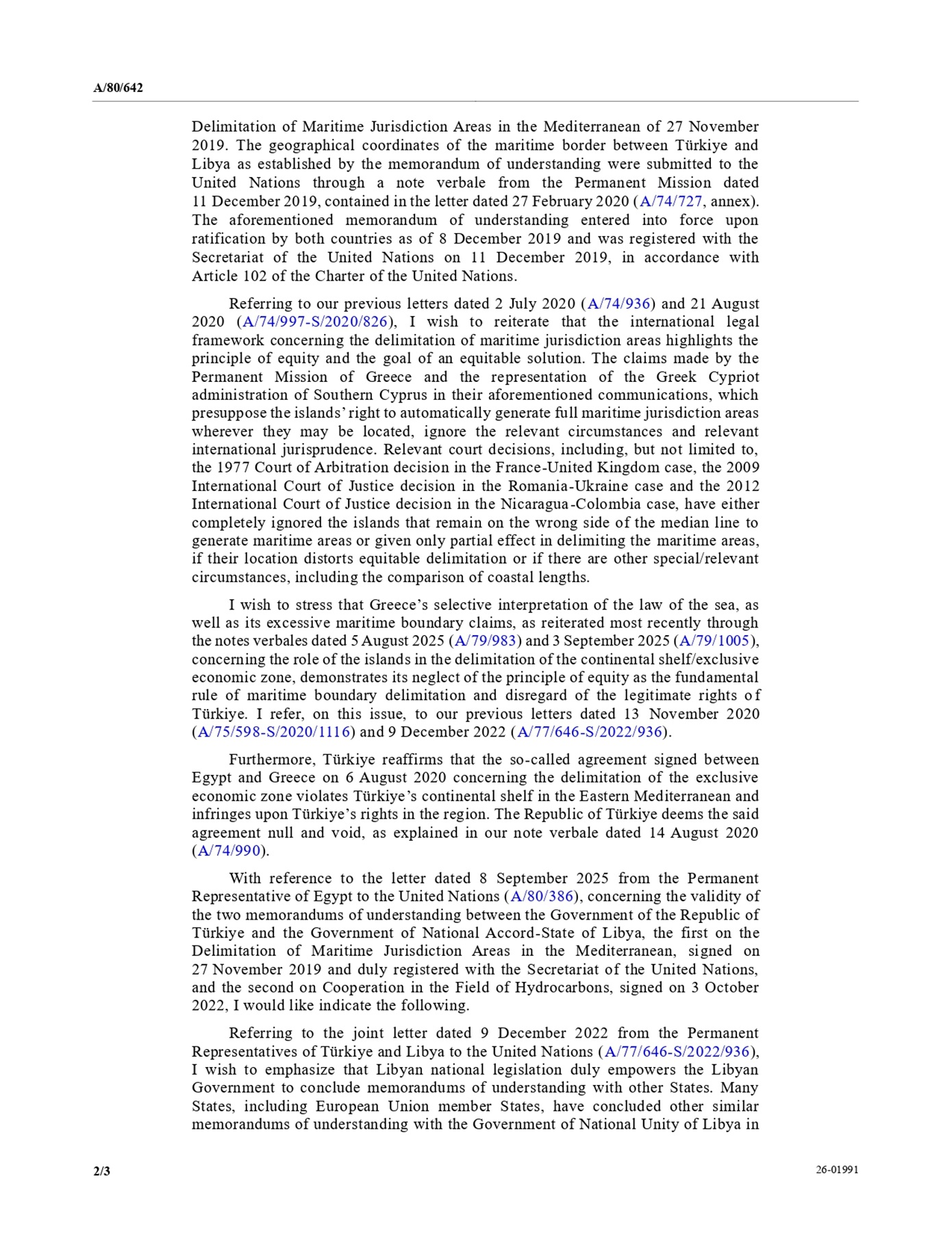 Η επιστολή επανέρχεται στο τουρκολιβυκό μνημόνιο του 2019, το οποίο η Άγκυρα περιγράφει ως «νόμιμη συμφωνία οριοθέτησης θαλάσσιων ζωνών μεταξύ δύο παράκτιων κρατών», απορρίπτοντας τις ενστάσεις της Ελλάδας, της Κύπρου και άλλων κρατών της περιοχής. Στο κείμενο γίνεται αναλυτική αναφορά στις συντεταγμένες που έχει καταθέσει η Τουρκία και στις συμφωνίες με τη Λιβύη, με την Άγκυρα να ισχυρίζεται ότι «οι ελληνικοί ισχυρισμοί είναι αβάσιμοι» και ότι στόχο έχουν «να υπονομεύσουν τη νομιμότητα της λιβυκής κυβέρνησης και των συμφωνιών της με την Τουρκία».