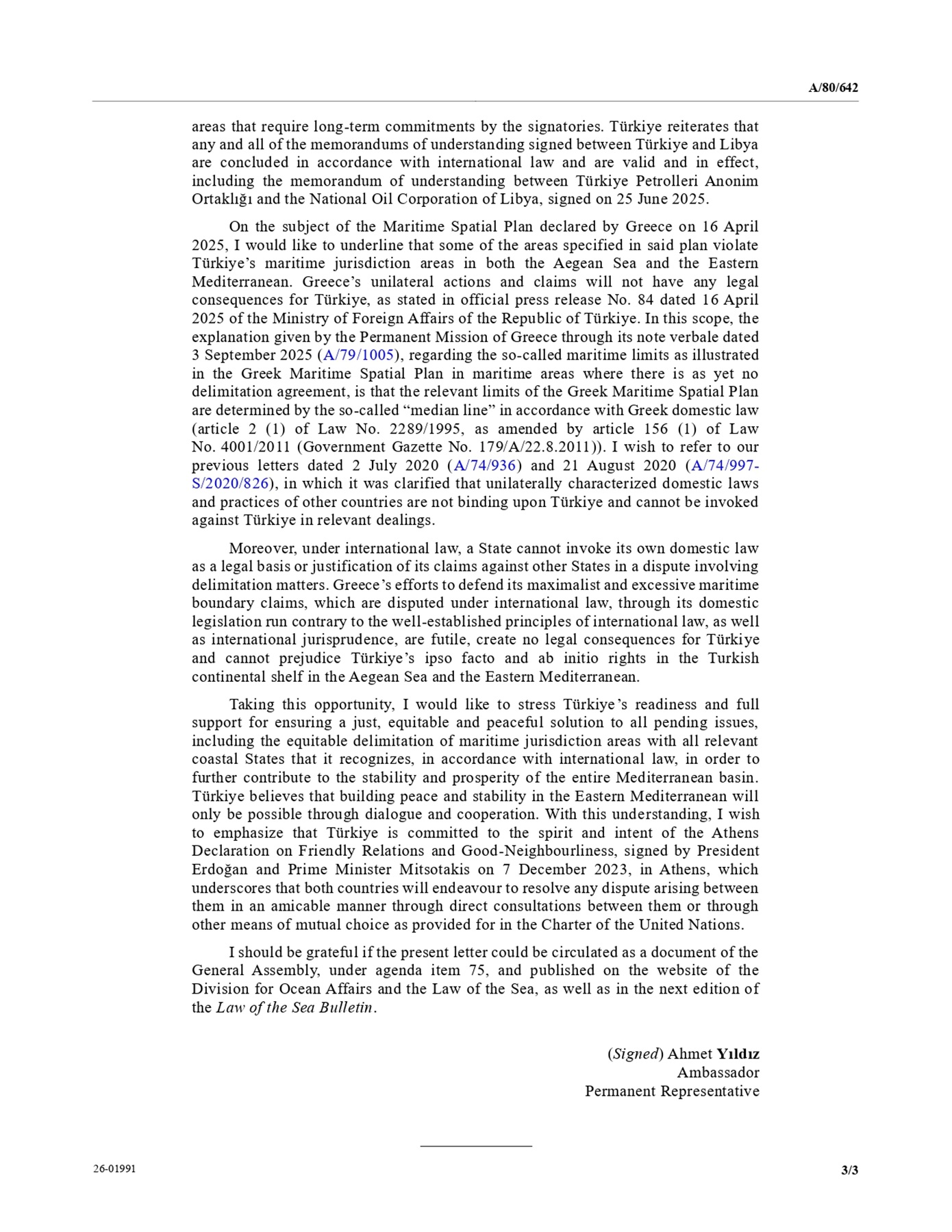 Στην επιστολή της, η Τουρκία χαρακτηρίζει τη συμφωνία Ελλάδας–Αιγύπτου για μερική οριοθέτηση ΑΟΖ ως «παράνομη» και χωρίς καμία έννομη συνέπεια για την Άγκυρα, υποστηρίζοντας ότι «παραβιάζει την τουρκική υφαλοκρηπίδα» στην Ανατολική Μεσόγειο. Κατηγορεί την Αθήνα για «επιλεκτική ερμηνεία» του Δικαίου της Θάλασσας και μιλά για «μαξιμαλιστικές αξιώσεις» που, όπως υποστηρίζει, δεν συμβαδίζουν με την αρχή της ευθυδικίας στην οριοθέτηση θαλασσίων ζωνών.