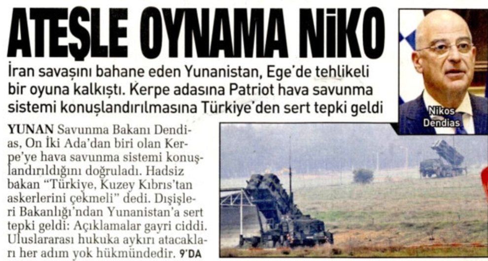 Ιδιαίτερη αναφορά στον Έλληνα υπουργό Άμυνας, Νίκο Δένδια, κάνει η τουρκική εφημερίδα Sabah, η οποία κυκλοφορεί σήμερα με πρωτοσέλιδο τίτλο «Μην παίζεις με τη φωτιά, Νίκο». Με αυτόν τον τρόπο η τουρκική εφημερίδα αποτυπώνει τη δυσαρέσκεια της Άγκυρας για την απόφαση μεταφοράς συστοιχίας πυραύλων του συστήματος Patriot στο νησί της Καρπάθου.