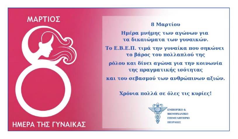 Με αφορμή την Παγκόσμια Ημέρα της Γυναίκας, ο πρόεδρος του Εμπορικού και Βιομηχανικού Επιμελητηρίου Πειραιώς, Βασίλης Κορκίδης, εξέφρασε τον σεβασμό και την ευγνωμοσύνη του προς όλες τις γυναίκες για τη συμβολή τους στην κοινωνία και την οικονομία.