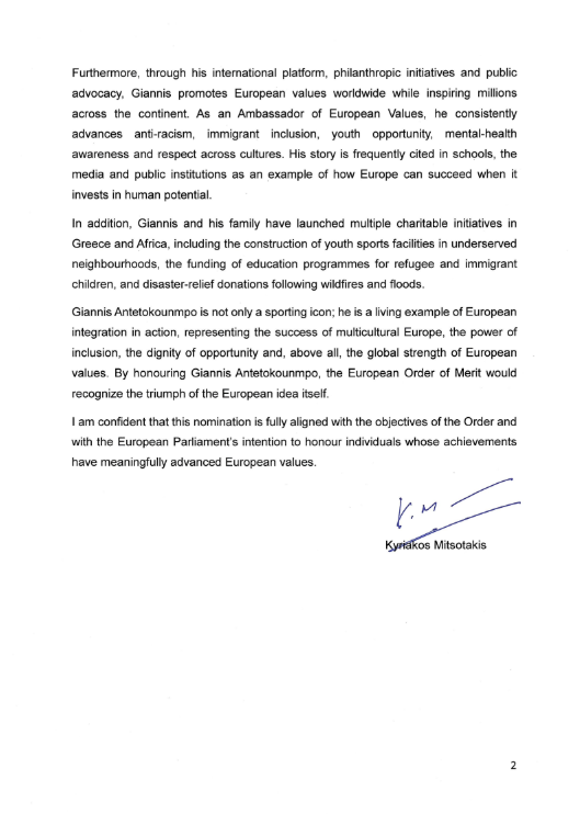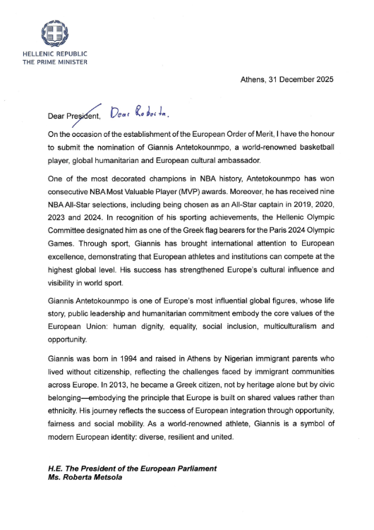 «Ο Γιάννης Αντετοκούνμπο είναι μια από τις πιο επιδραστικές παγκόσμιες προσωπικότητες της Ευρώπης, του οποίου η ιστορία ζωής, η δημόσια ηγεσία και η δέσμευση στα ανθρωπιστικά ιδεώδη ενσαρκώνουν τις βασικές αξίες της Ευρωπαϊκής Ένωσης: την ανθρώπινη αξιοπρέπεια, την ισότητα, την κοινωνική ένταξη, την πολυπολιτισμικότητα και τις ευκαιρίες», σημειώνει χαρακτηριστικά στην επιστολή του προς τη Ρομπέρτα Μέτσολα ο Κυριάκος Μητσοτάκης.