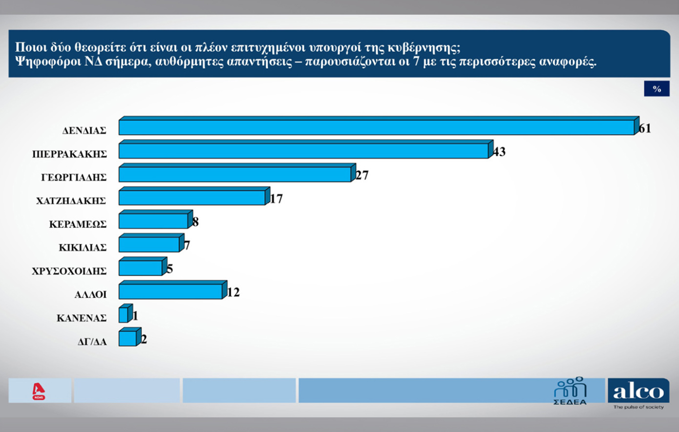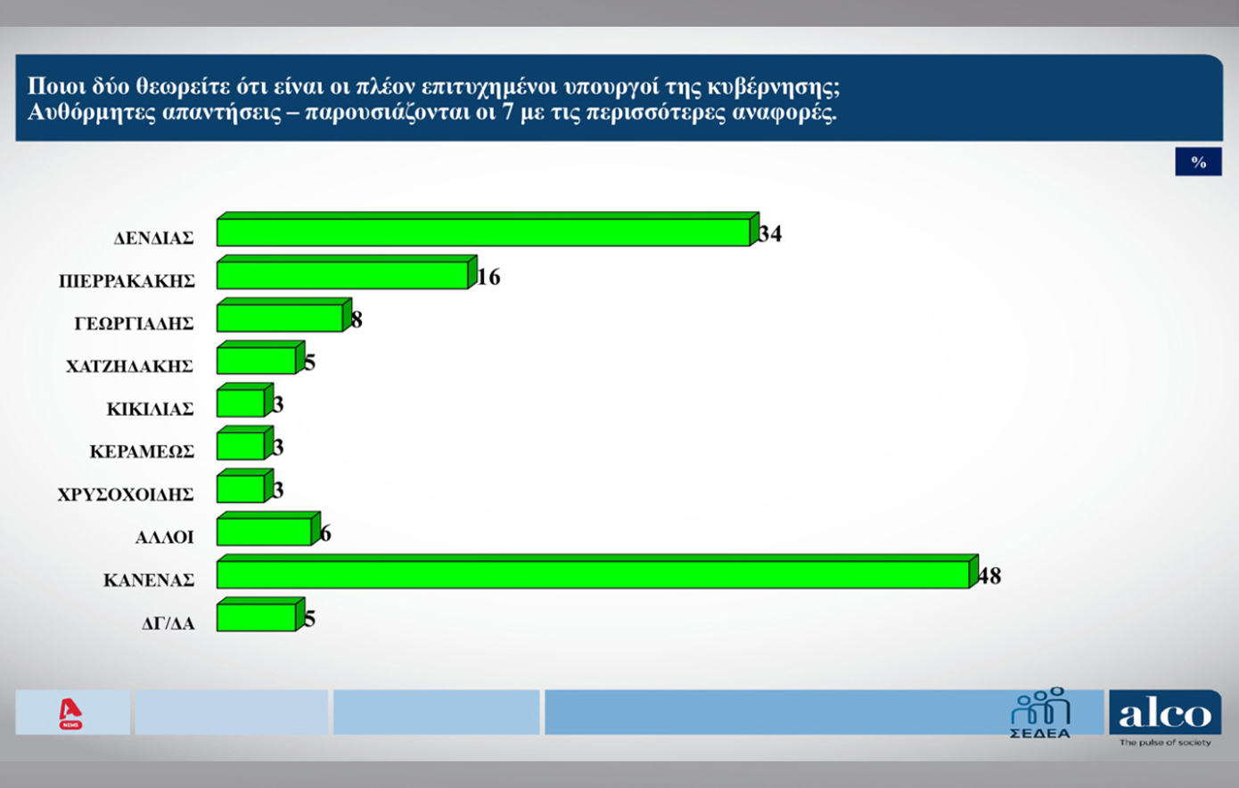 Στο δεύτερο μέρος οι πολίτες ρωτήθηκαν γιαν υπουργό της κυβέρνης που θεωρούν πιο επιτυχημένο, με τον Νίκο Δένδια να έρχεται πρώτος με ποσοστό 34%.