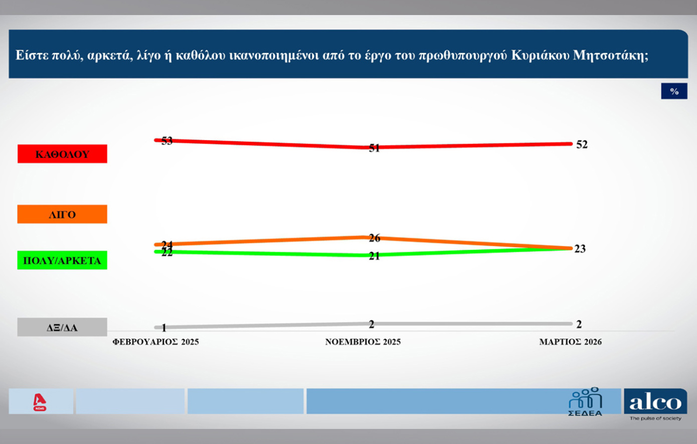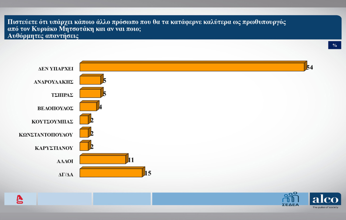Επίσης, στο ερώτημα ποιος πολιτικός θα μπορούσε να ασκήσει καλύτερα τα καθήκοντα του πρωθυπουργού από τον Κυριάκο Μητσοτάκη, ο «κανένας» πήρε 54%, ενώ ακολούθησαν οι Νίκος Ανδρουλάκης και Αλέξης Τσίπρας με 5%.