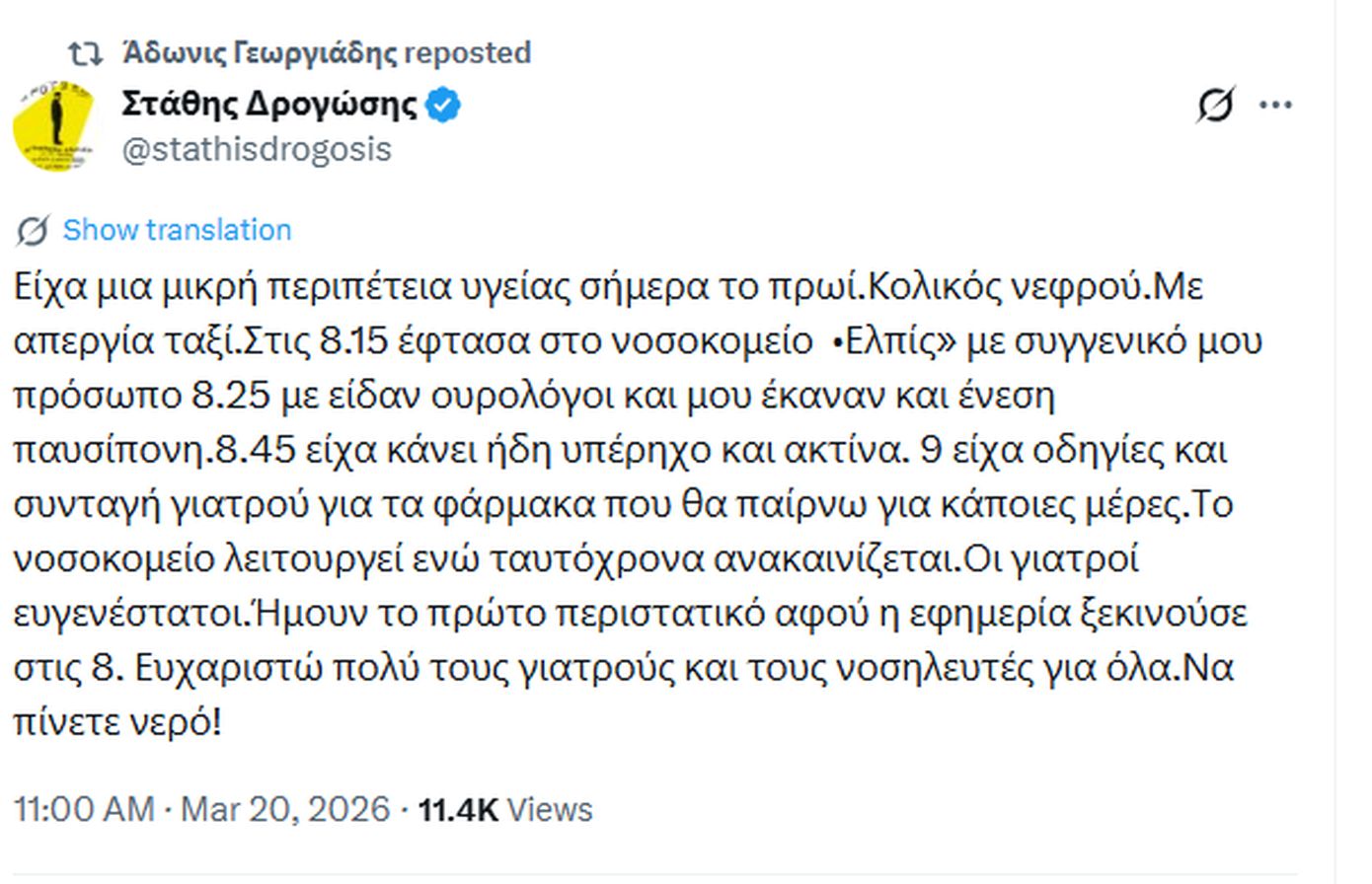 «Είχα μια μικρή περιπέτεια υγείας σήμερα το πρωί. Κολικός νεφρού. Με απεργία ταξί. Στις 8:15 έφτασα στο νοσοκομείο “Ελπίς” με συγγενικό μου πρόσωπο. 8:25 με είδαν ουρολόγοι και μου έκαναν και ένεση παυσίπονη. 8:45 είχα κάνει ήδη υπέρηχο και ακτίνα. Στις 9 είχα οδηγίες και συνταγή γιατρού για τα φάρμακα που θα παίρνω για κάποιες μέρες. Το νοσοκομείο λειτουργεί ενώ ταυτόχρονα ανακαινίζεται. Οι γιατροί ευγενέστατοι. Ήμουν το πρώτο περιστατικό αφού η εφημερία ξεκινούσε στις 8. Ευχαριστώ πολύ τους γιατρούς και τους νοσηλευτές για όλα. Να πίνετε νερό!».