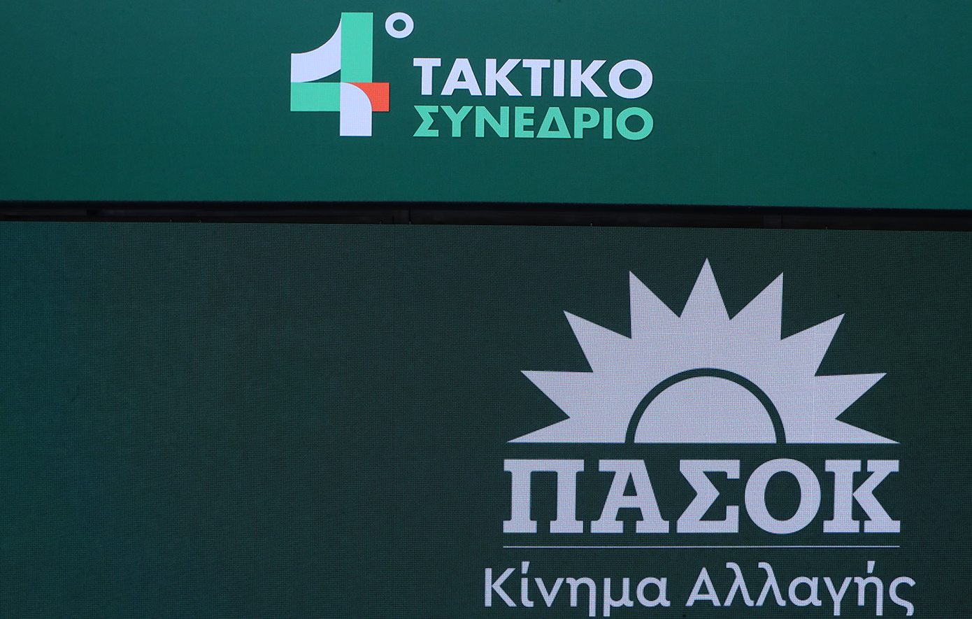 Το σκηνικό πλαισιώνουν μεγάλοι ηλεκτρονικοί πίνακες που προβάλλουν τα συνθήματα του ΠΑΣΟΚ, καθώς και πλακάτ για το 4ο τακτικό συνέδριο.