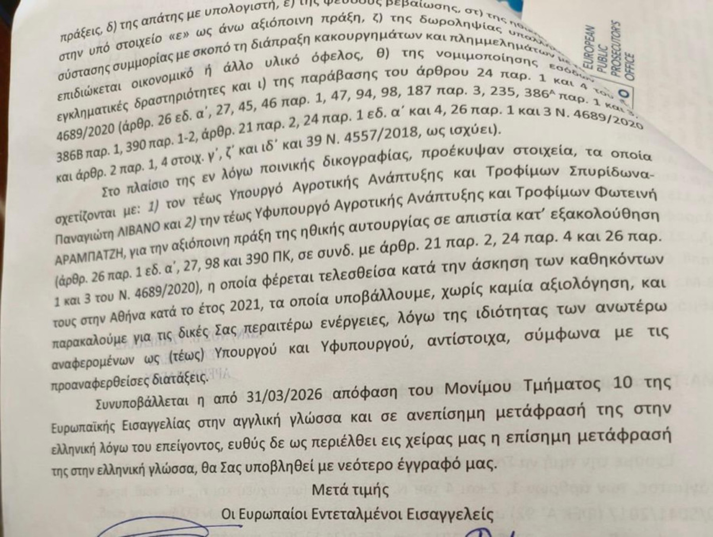 Στο πλαίσιο της εν λόγω ποινικής δικογραφίας, προέκυψαν στοιχεία, τα οποία σχετίζονται με: 1) τον τέως Υπουργό Αγροτικής Ανάπτυξης και Τροφίμων Σπυρίδωοία Παναγιώτη ΛΙΒΑΝΟ και 2) την τέως Υφυπουργό Αγροτικής Ανάπτυξης και Τροφίμων Φωτεινή ΑΡΑΜΠΑΤΖΗ, για την αξιόποινη πράξη της ηθικής αυτουργίας σε απιστία κατ’ εξακολούθηση (άρθρ. 26 παρ. 1 εδ. α΄, 27, 98 και 390 ΠΚ, σε συνδ. με άρθρ. 21 παρ. 2, 24 παρ. 4 και 26 παρ. 1 και 3 του Ν. 4689/2020), η οποία φέρεται τελεσθείσα κατά την άσκηση των καθηκόντων τους στην Αθήνα κατά το έτος 2021, τα οποία υποβάλλουμε, χωρίς καμία αξιολόγηση, και παρακαλούμε για τις δικές Σας περαιτέρω ενέργειες, λόγω της ιδιότητας των ανωτέρω αναφερομένων ως (τέως) Υπουργού και Υφυπουργού, αντίστοιχα, σύμφωνα με τις προαναφερθείσες διατάξεις.