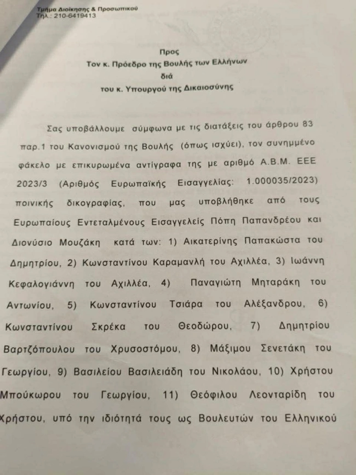 Έχουμε την τιμή να Σας υποβάλλουμε, σύμφωνα με τις διατάξεις του άρθρου 86 του Συντάγματος, των άρθρων 1, 2 και 4 του Ν. 3126/2003 (ως ισχύει) και της υπ’ αριθ. πρωτ. 8130/5041/2017 (ΦΕΚ Α΄ 92) αποφάσεως της Ολομέλειας της Βουλής των Ελλήνων, σε συνδ. με τις υπ’ αριθ. πρωτ. 7205/8.8.2017 και 4560/24.12.2003 συναφείς παραγγελίες Σας, κεκυρωμένα αντίγραφα (και κατάσταση με καταγεγραμμένα τα στοιχεία αυτής, αριθμημένα κατ’ αύξοντα αριθμό) της συνημμένης υπ’ αριθ. Β.Μ. ΕΕΕ 2026/62 (αριθμός ταυτοποίησης Ευρωπαϊκής Εισαγγελίας: 1.000517/2026) ποινικής δικογραφίας, η οποία σχηματίστηκε εξ αντιγράφων μέρους της υπ’ αριθ. Β.Μ. ΕΕΕ 2023/3 (αριθμός ταυτοποίησης Ευρωπαϊκής Εισαγγελίας: 1.000035/2023) δικογραφίας, κατόπιν της από 31/03/2026 απόφασης του Μονίμου Τμήματος 10 της Ευρωπαϊκής Εισαγγελίας, με την οποία αποφασίστηκε η παραπομπή της στις αρμόδιες ελληνικές αρχές και δη στην Βουλή των Ελλήνων, κατ’ ανάλογη εφαρμογή της διάταξης του άρθρου 34 (1) του Κανονισμού (ΕΕ) 2017/1939 του Συμβουλίου της 12.10.2017 «σχετικά με την εφαρμογή ενισχυμένης συνεργασίας για τη σύσταση της Ευρωπαϊκής Εισαγγελίας».